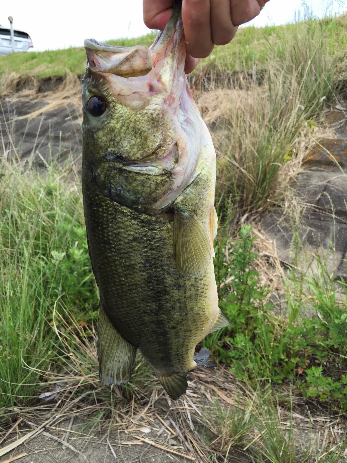 2投目。ドックの脇にダウンショットを入れて引いたところ、また来た!!今度はしっかり合わせて、絶対にバレないようにしっかりファイトする。しかしこのバスやたら引く。今までで一番強い引きだったかも。なんとかランディング成功。これがそのバス。