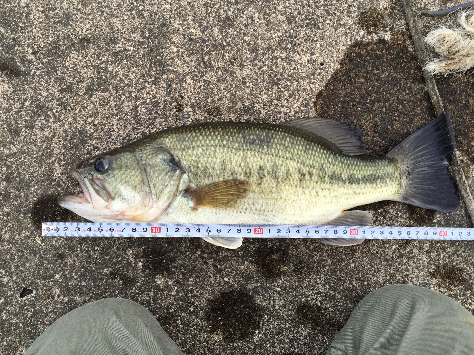 40cmぐらいのバス。痩せていて、体にキズが結構あった。アフタースポーンのバスでしょうか。アシ際にフリックシェイクのダウンショットを落としたらガツンときました。