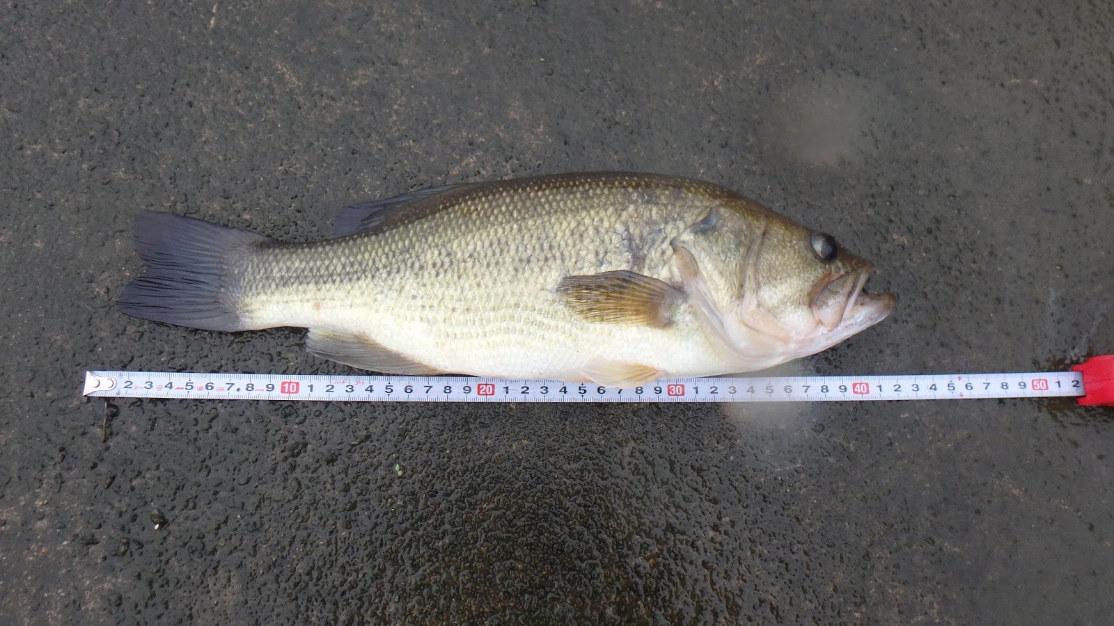 33cmぐらいのバス。すぐに結果出たぞ。さすが石積みエリアだ。魚影が濃いわ。どっかに魚はいるので、喰わせる技術があれば確実に釣れんじゃないかな。他の場所だとまず魚いるところを探さないといけないけど、ここなら石積みエリアのどこかにいるというのはわかっているので楽だわ。
