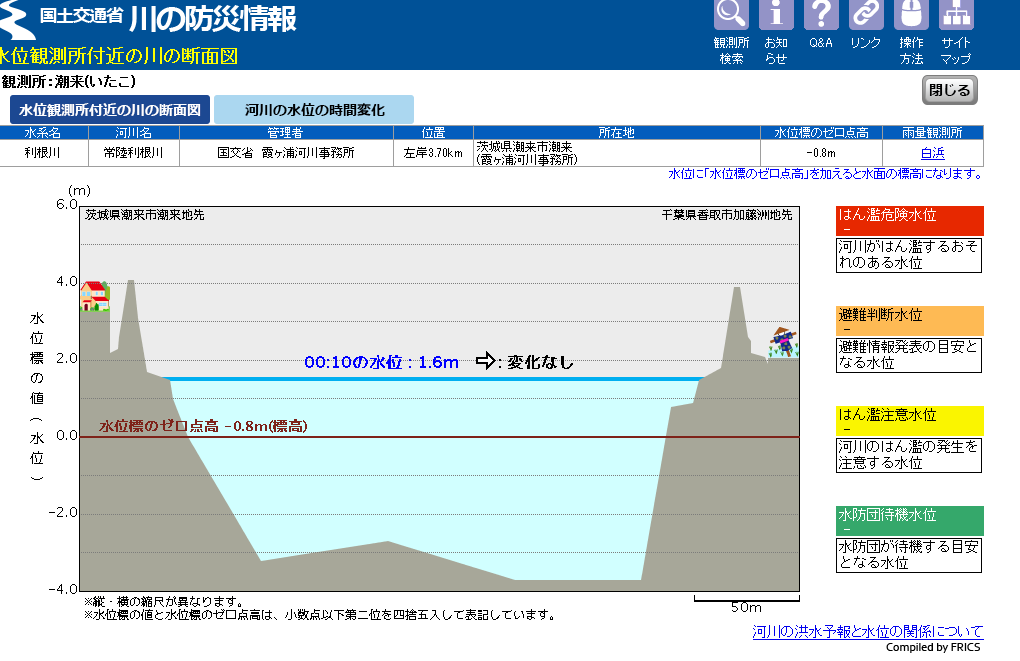 潮来:川の防災情報 :水位観測所付近の川の断面図