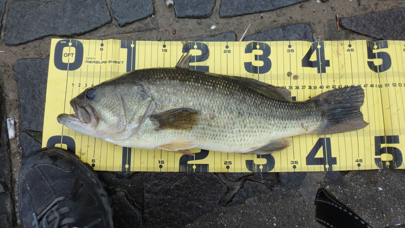 きたーーー!46cm!ギリ47cmいっているが、まあ46cmにしておこう。 意外とデカかった。それほど引きは強くなかった。ルアーはいつものエグジグハイパー5/64ozにトレーラーはドライブクローです。ちょっと痩せているが、重さを測ったところ、
