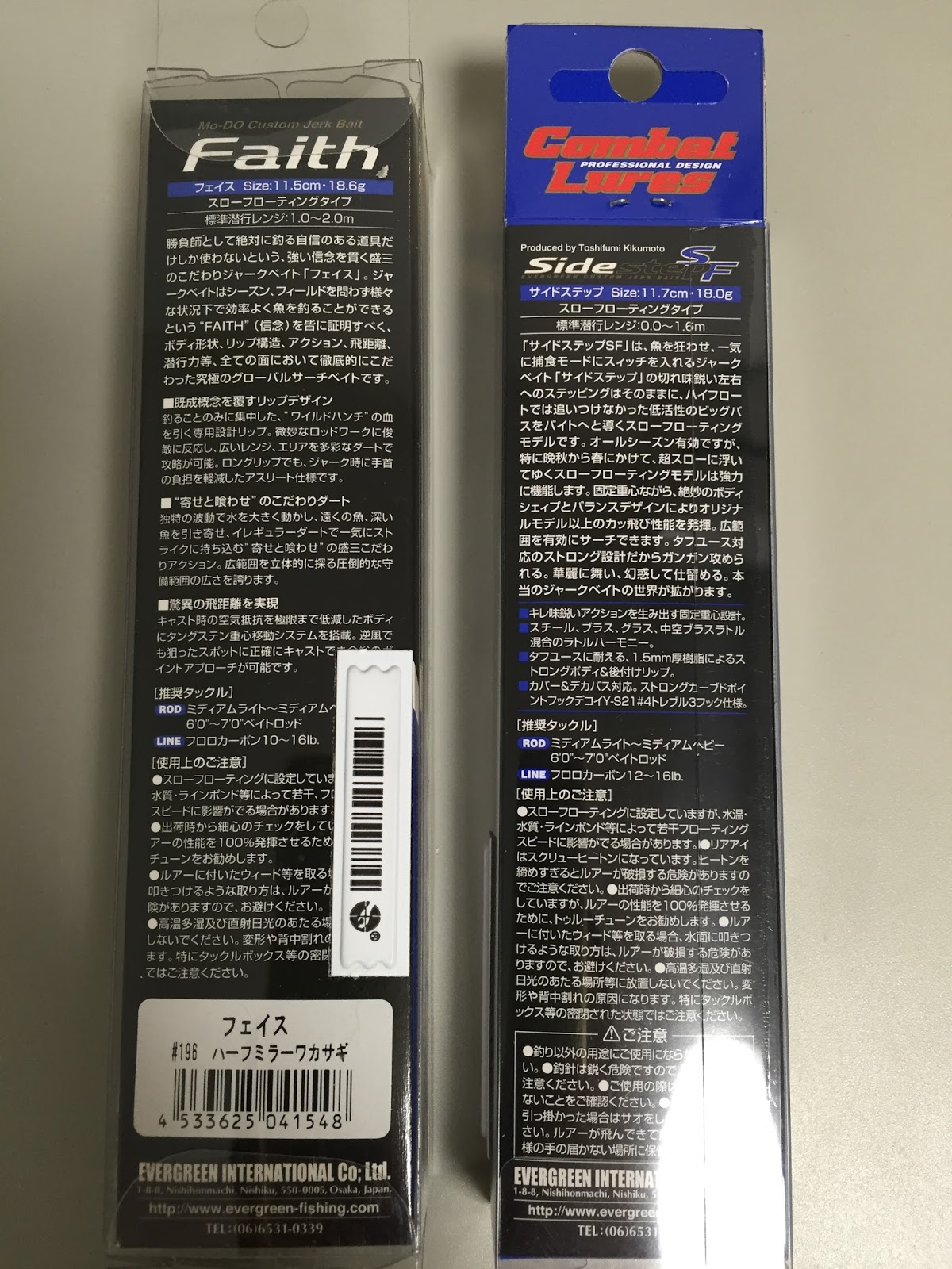 今日はまたミノー買っちゃいました。色々と比べたくなってきて、ついつい買い足してしまう。今回はエバーグリーンのFaith(フェイス)とSideStep(サイドステップ)のスローフローティングです。