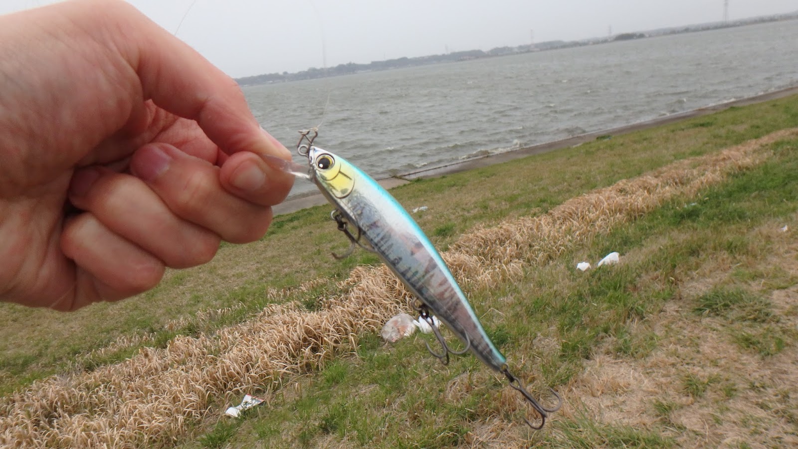 ここでミノー釣りました。フックが錆びていないので結構新しい。ありがたく頂戴しておこう。今日はスモラバ2個無くしているので、これでチャラだな。結局ここはこのミノーだけ。バスの反応なし。風強すぎand寒すぎて釣りにならない。本日はこれにて終了しました。