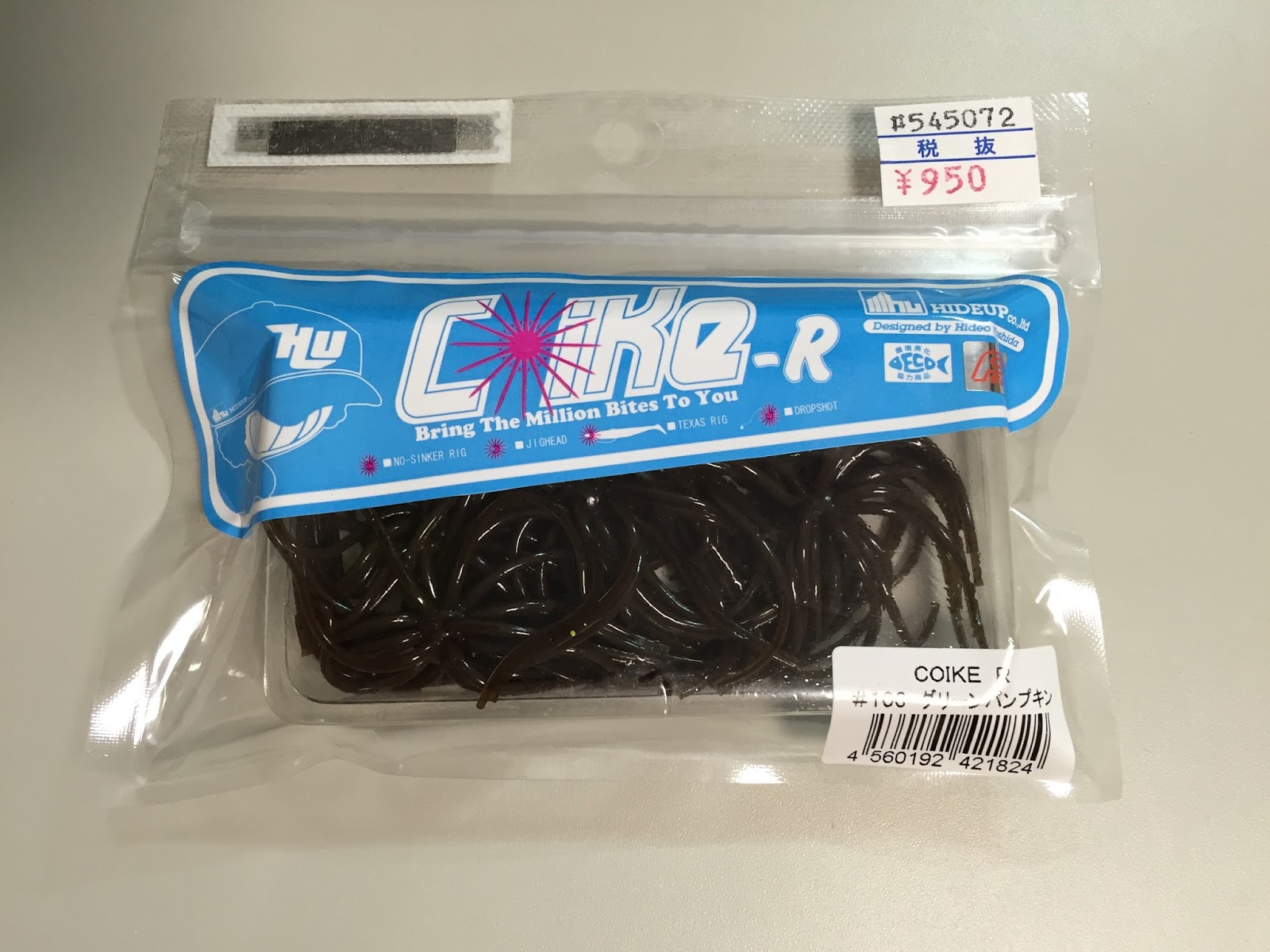 HIDEUPのコイケ-Rというワーム。前から気になっていたのだが、店頭で見たのは初めてだ。即パクでした。まあ見た感じかなり意味不明なワームです。でも釣れそう。こんな感じ↓