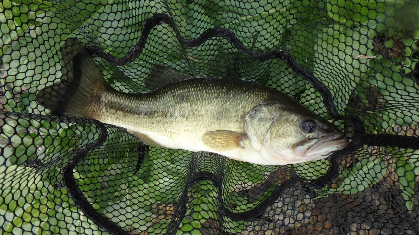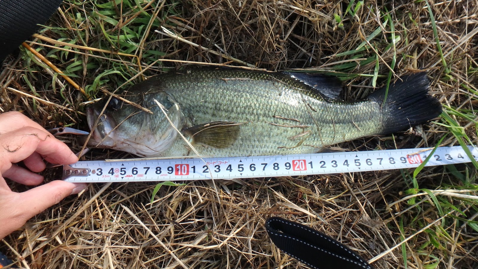 しかし、まったく反応なし!ヤベーあてにしていたのにな。結構先行者も多かった。もう釣られてしまったのかな。場所選択は間違ってないと思うが、、。1時間半ぐらいアタリなし、そろそろ帰る時間になってきた。ちょい移動して、ここで最後という場所に来た。以前も1匹釣った場所。来いよ、来いよと思って、投げたら、なんとガツンとキタ!!デカイ!今日の他のバスとは全然引きが違う!少々時間がかかったが、なんとかネットにバスを収める。思わずガッツポーズ出た。