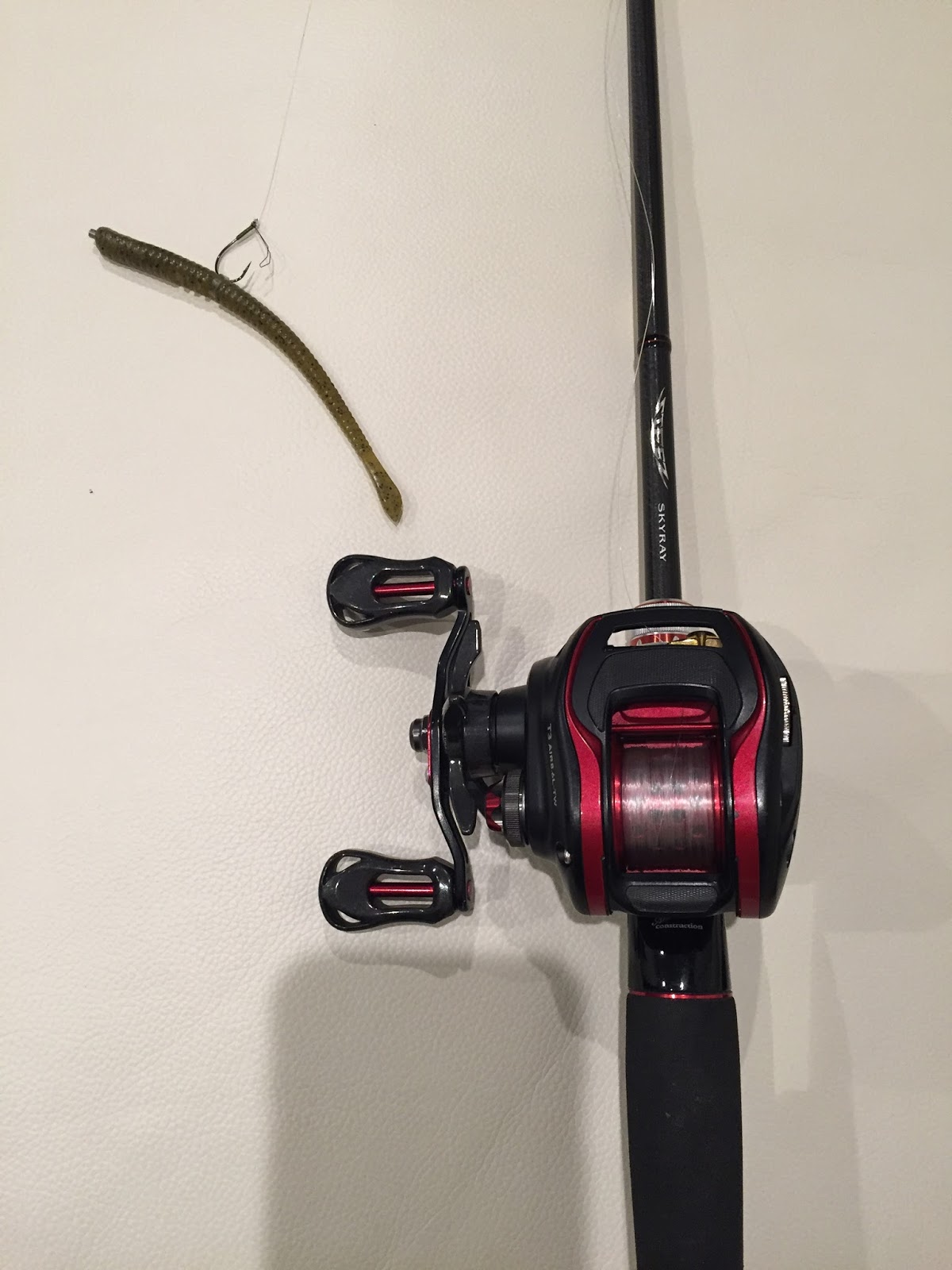 このタックルの使用頻度は70%以上です。まあほぼこればっかりですね。なんだかんだよく釣れるので、やっぱ使ってしまいますね。このロッドの良いところは、竿先は結構柔らかいのだが、バスをかけた時は粘り腰がある。細いラインでカバーの奥でバスをかけても竿の粘りで引きずり出せて、安心感がありますね。