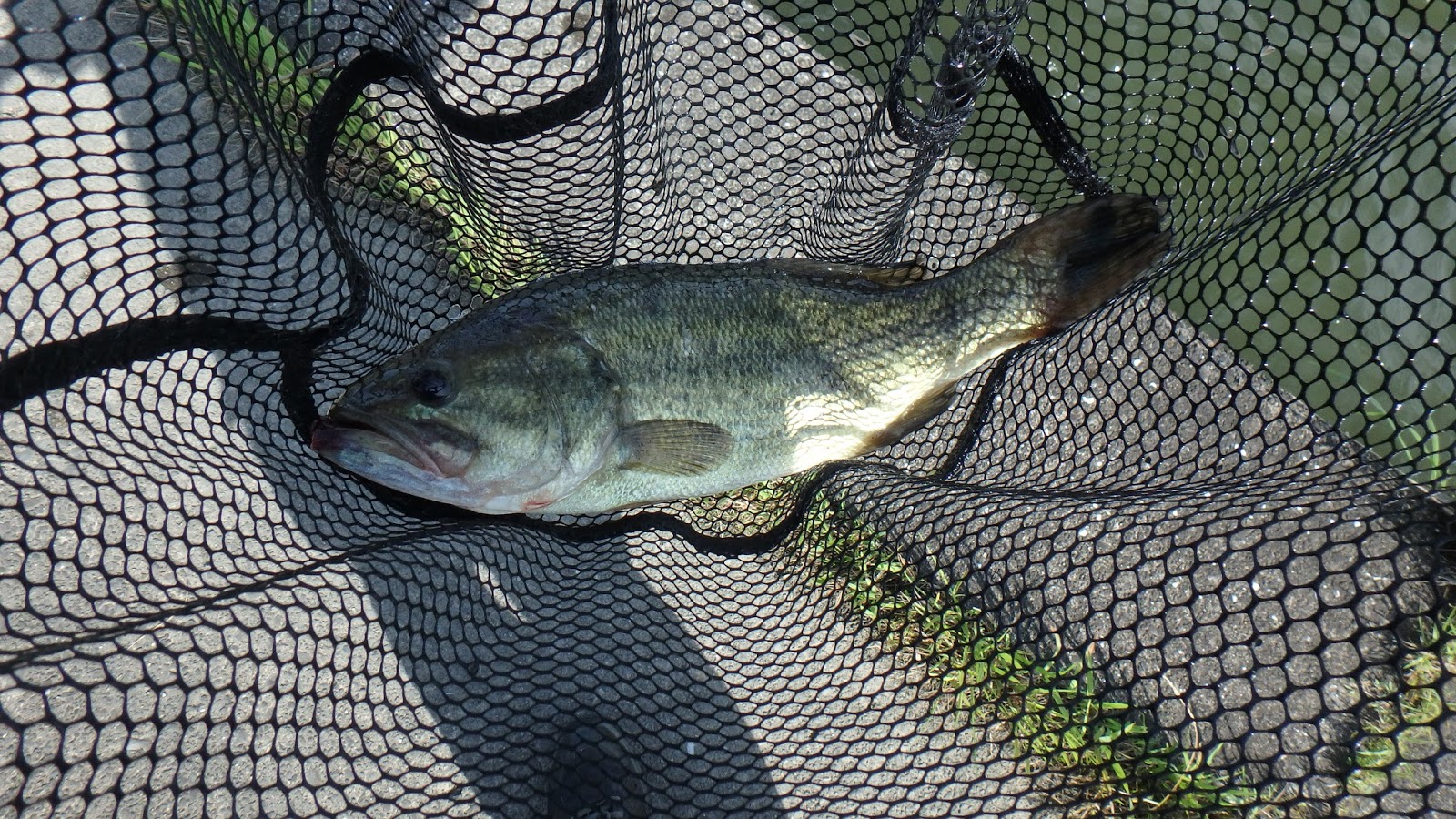 また、ちょっと移動して、今度はシザーコーム3inchのダウンショットリグで攻めたところ、バイトがあった。なんかぬるっとしたアタリだったが、もう一度同じところを攻めたところ、またキタ!あまりデカくないのでブッコ抜く。