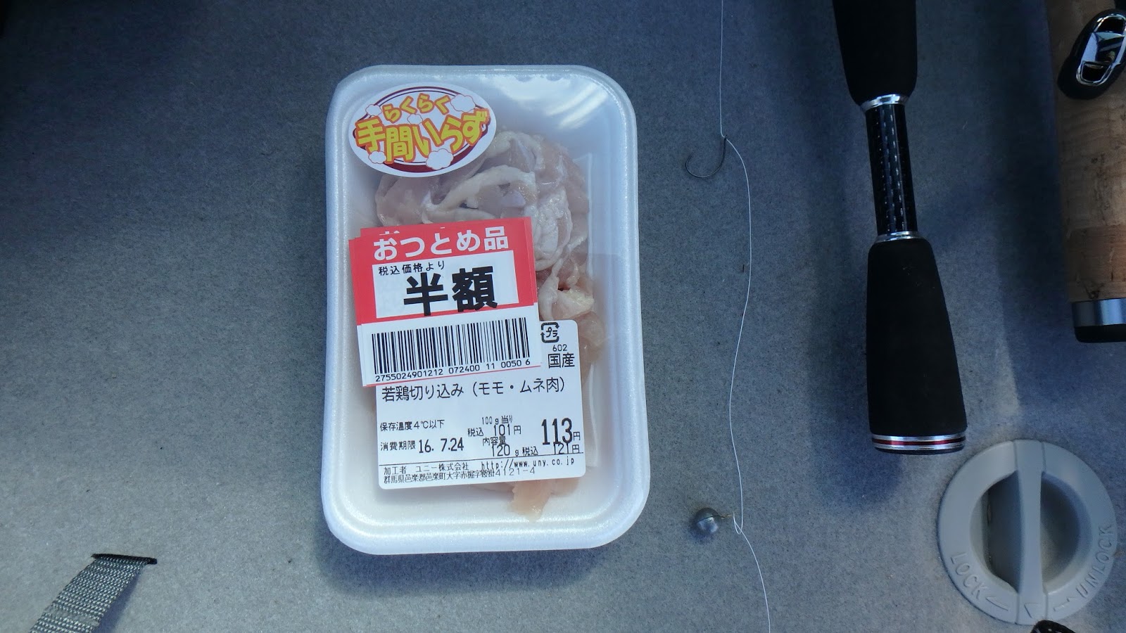 今回ズーナマのエサは、鶏のモモ肉。刺し身にしようかと思ったが、高いので、鶏肉にした。しかもおつとめ品の半額の奴。仕掛けは、バーブレスのマスバリをPEラインで直結。ノットはパロマーノット。シンカーは鉛。PEラインは0.8号の8本よりで、15lb。メーカーは東レのシーバスPEという奴。