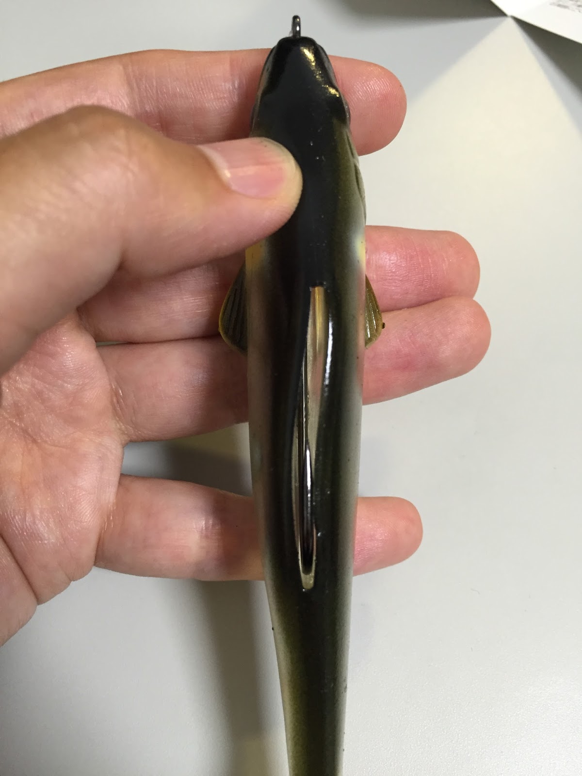 背中にスリットが入っていて、フックが完全に隠れます。外からフックが見えないというのが、このルアーの最大の売り。
