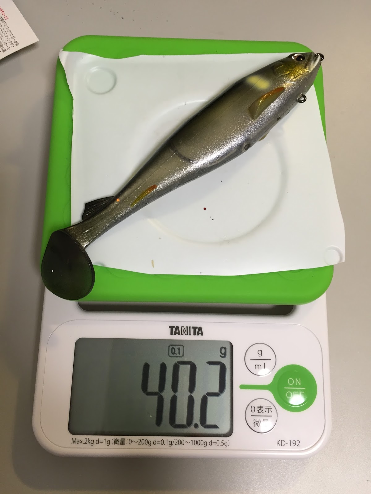ノーシンカーとヘビーウエイトジグヘットの2つある。ノーシンカーが32.8g、ヘビーが40.2gです。2つ入っていて値段が1,800円というのはなかなかお得ですね。この手のスイムベイトは1個でもっと値段がするものもありますからね。なかなか戦略的な値段設定ですね~。もうちょい高くても売れると思うけどね。他社を潰しにかかっているのか?!