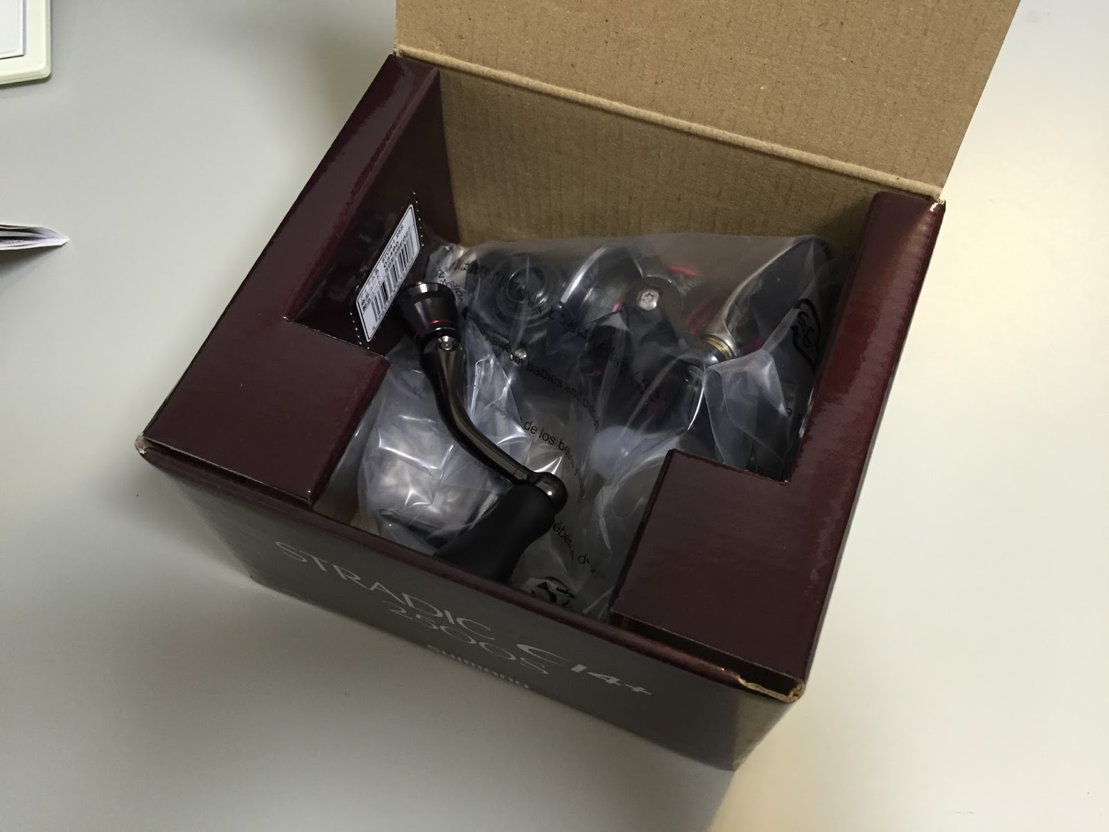 箱です。STRADIC Cl4+の2500Sを買いました。大体いつも買うのは2500番台ですね。バス釣りにはデカすぎず、小さ過ぎないちょうどいい大きさだと思う。どのサイズを買うか迷ったらとりあえず2500番を買っておけば問題ない。値段は22,000円ぐらい。