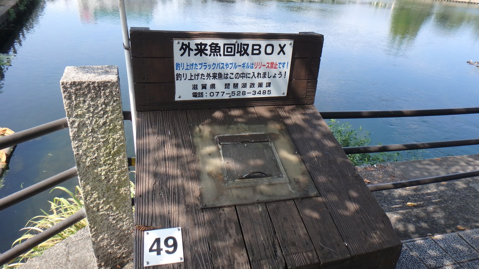出ました!これが悪名高い?外来魚回収BOXだな。 なか覗いたけど何も入ってねーな。無駄なことしよって、、。ふと近くの流れ込みを見たら、30cmぐらいのバスがたくさん居たわ。とりあえずバスがいることはわかった。またちょっと移動する。