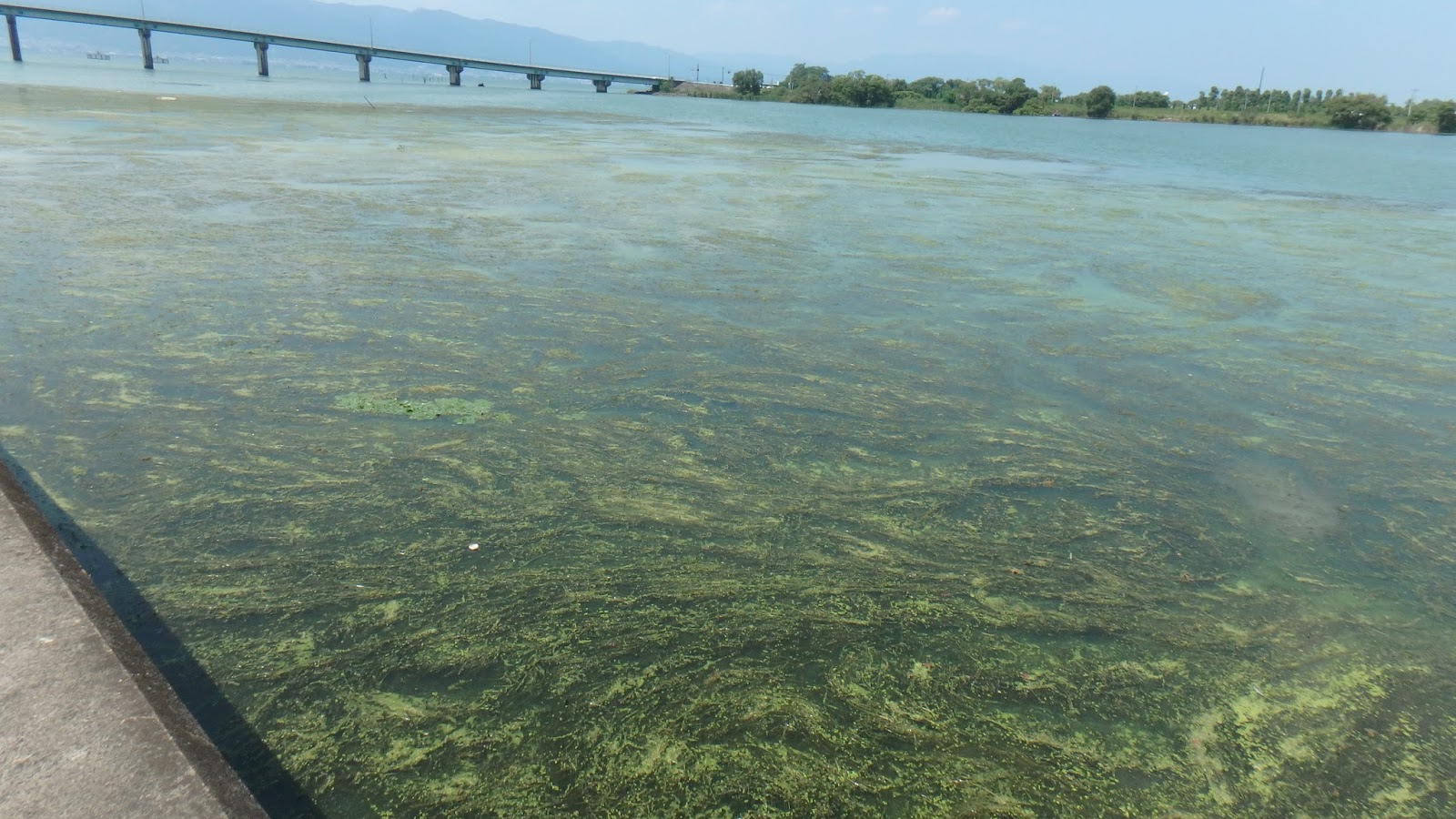 水きたねー!連日35℃超えているし、雨が降っていないせいと思われる。アオコとウィードが混ざって、それが一面に広がっている。北湖は綺麗だったのにこの差はなんだ。例えると河口湖から土浦に移動したような感じだね。