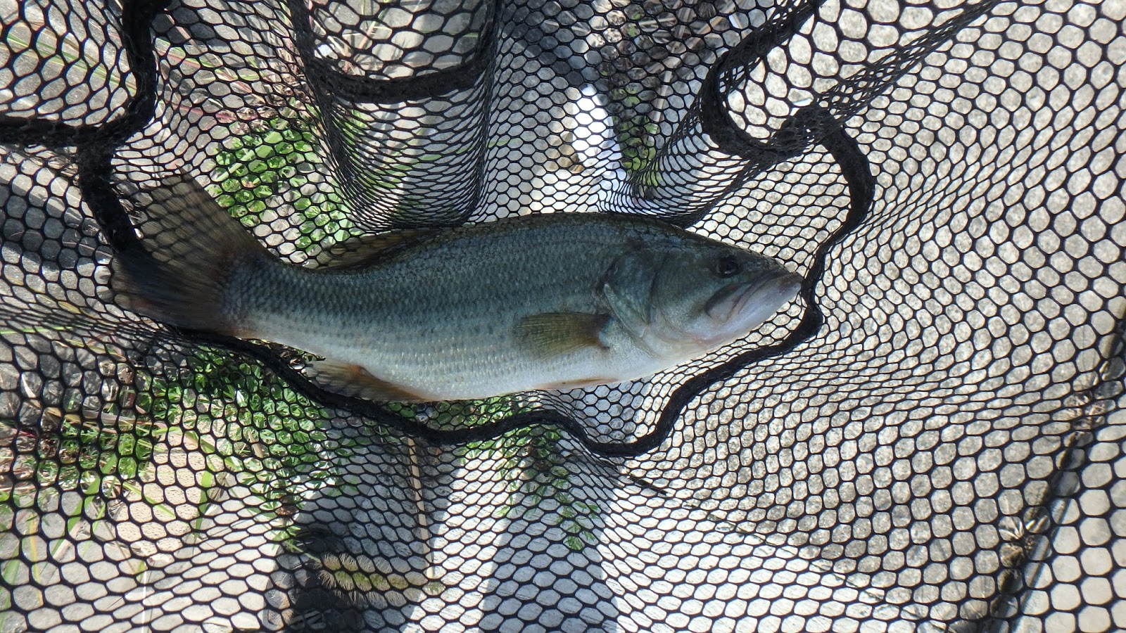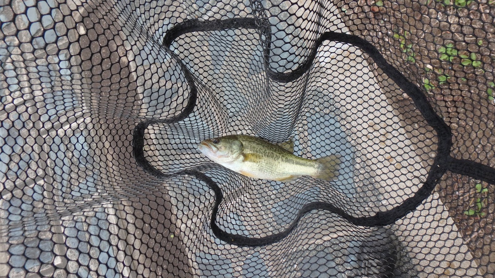ここもネコリグで攻める。とあるポイントでネチネチ攻めているとガツンとキタわ。結構重い引きだ。デカイかもしれない!でもズーナマかな?なんて思ったが、バスの魚体だ!慎重にバトルして、ランディング成功!