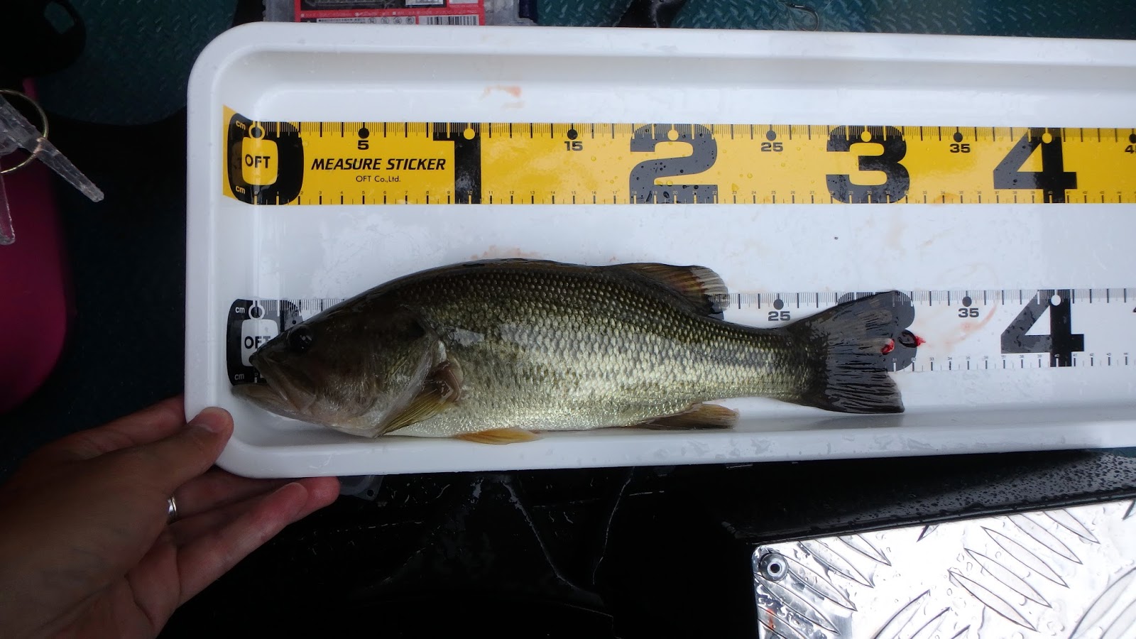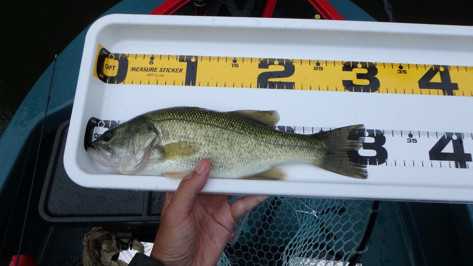 30cmジャスト。待望の1匹が出ました。長かったわ。メジャーは今回初導入のプランターメジャーです。よく霞ヶ浦のオカッパリバサーが使っている奴ね。自分もついに自作してみました。これもスゲー便利だわ。測るのがすごい楽だし、バスへの負担も軽いね。 で、さらに続けてもう1匹キマシタ!