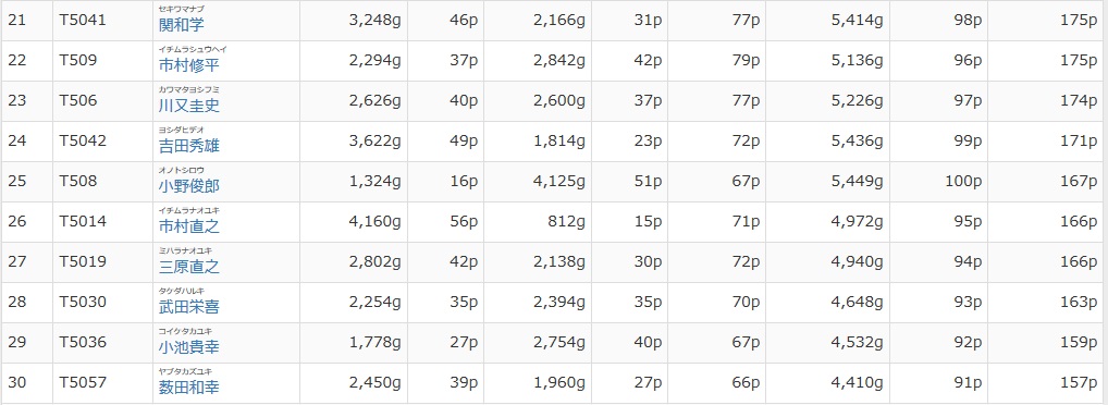 そんな中で、初日トップの沢村プロは連日の5,000gオーバーですね。凄すぎますわ。この人は歳を取っても全然衰える気配がないですね。見た目も結構若いし、背筋も伸びているので、なんかトレーニングで鍛えているのかな。青木大介プロも5,000g超えで巻き返して来たので明日が楽しみですわ。