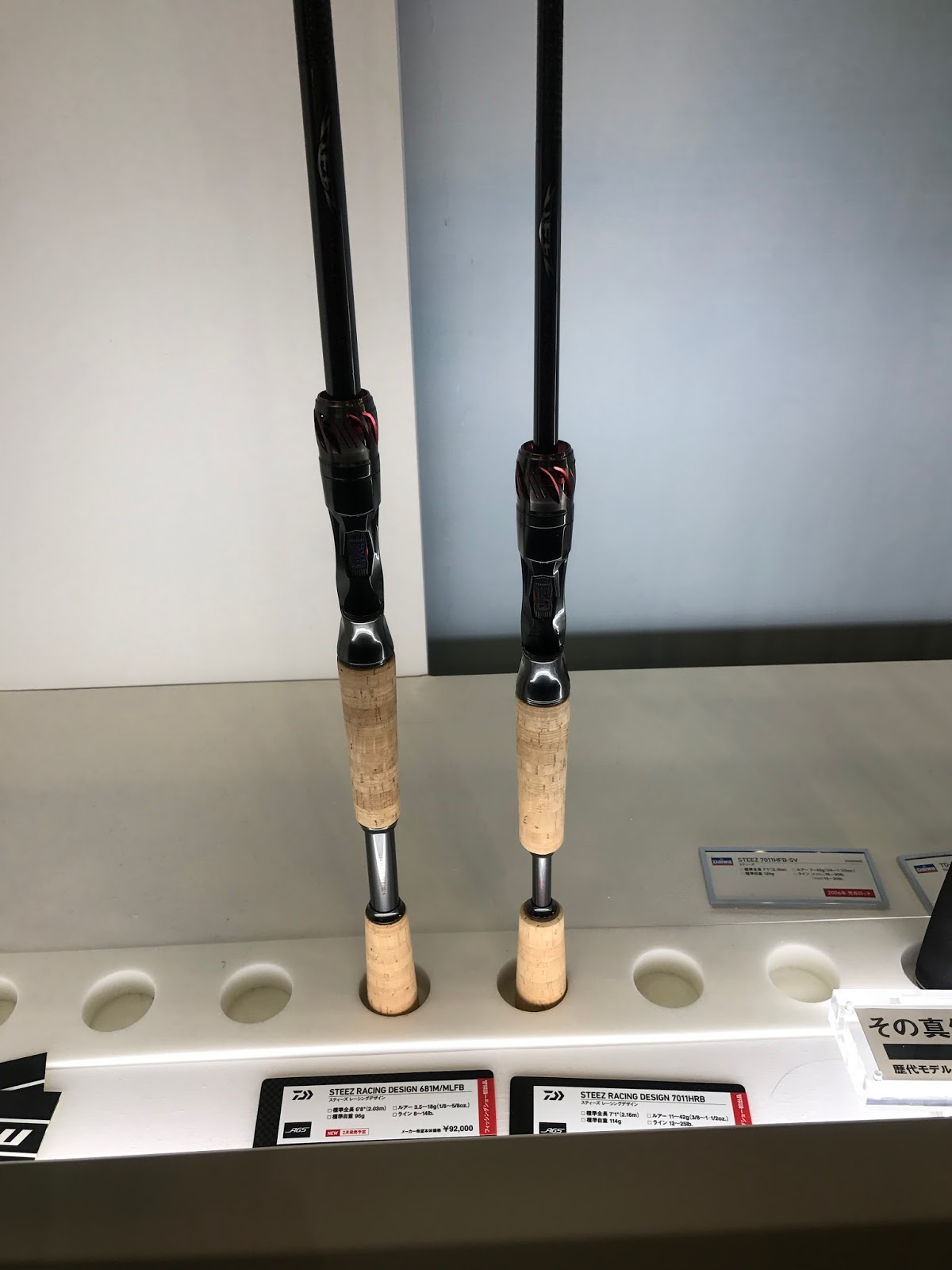 気を取り直して、まずはダイワのブースに直行です。お目当てのスティーズレーシングデザインを見に行きました。混んでいるかなと思いきや、あっさり触ることができました。これが約10万円のロッドか、、と思いながら触ってました。