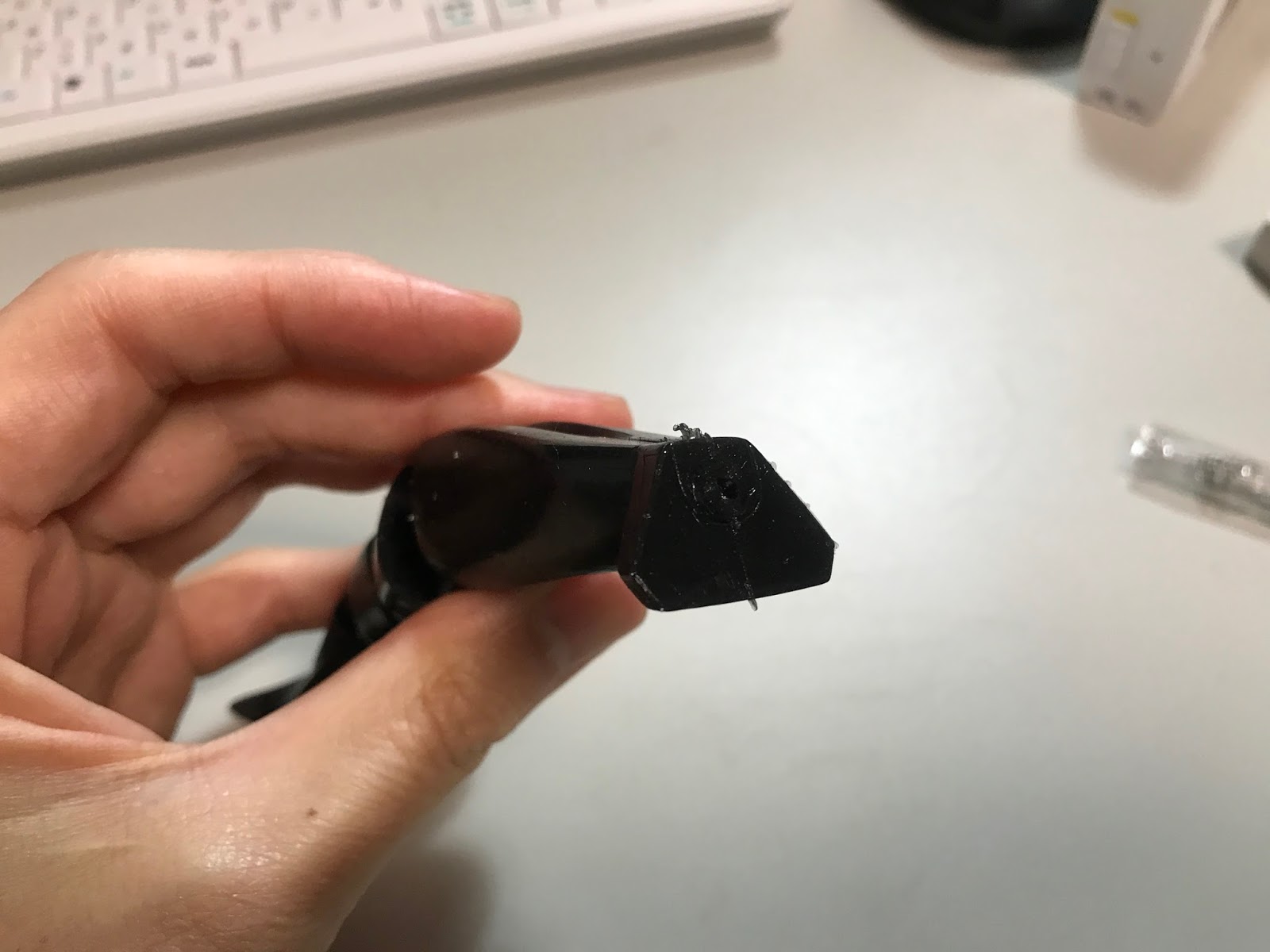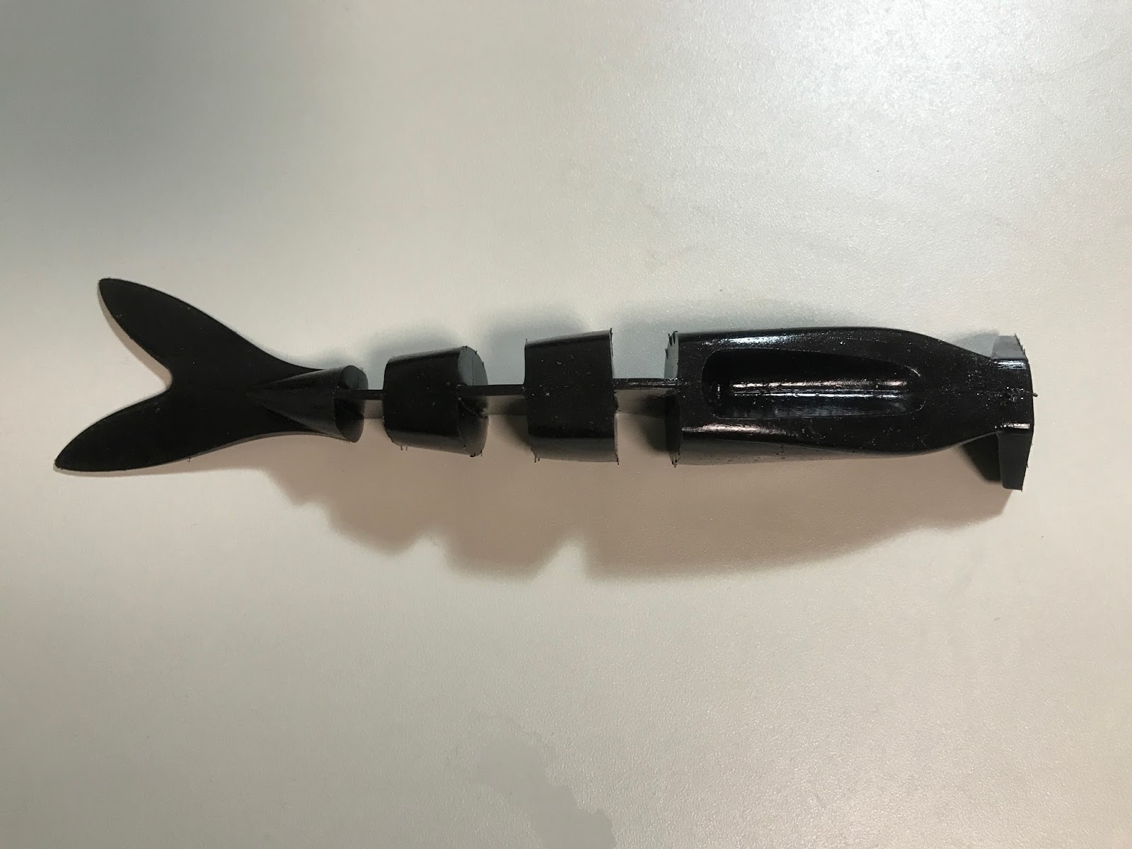 前から見たところ。前面のソフトデルタリップと呼ばれるところで水を受けて、その抵抗が各関節のジョイント部分に伝わり、左右のうねりを発生させるようです。で、写真撮っているときは気が付かなかったが、これ上下逆だったわ(;´Д`)。三角の底辺の方を上にするようです。