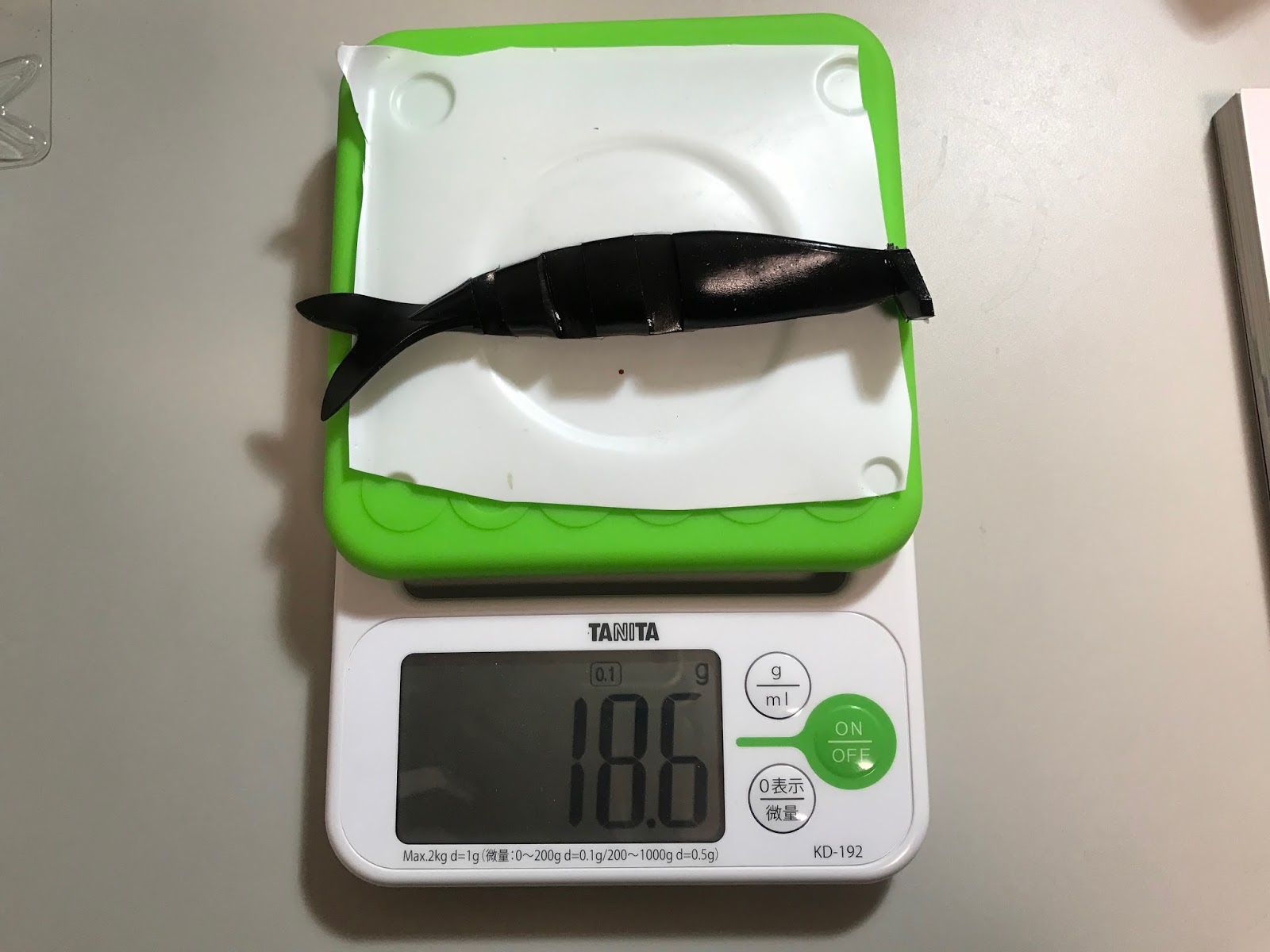 重量は18gある。ノーシンカーでもベイトタックルで余裕で投げられますね。基本ノーシンカーだと思うが、テキサスリグ、ヘビーキャロライナリグやチャターベイトのトレーラーとしても有効のようだ。