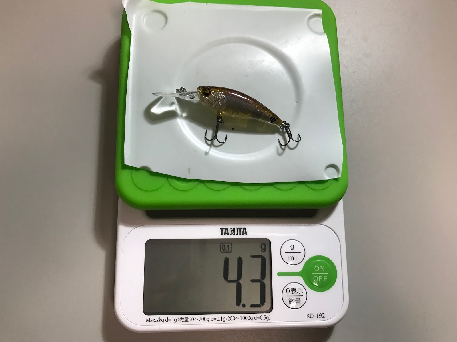 重さは4.3gある。軽めですが、重心移動機構になっているので、意外と飛距離が出ます。タックルはスピニングです。さすがに4gぐらいだとベイトフィネスではキツイかなと思います。投げられないことはないと思いますが。ベイトフィネスで投げるには6g以上はないとキツイですよね。