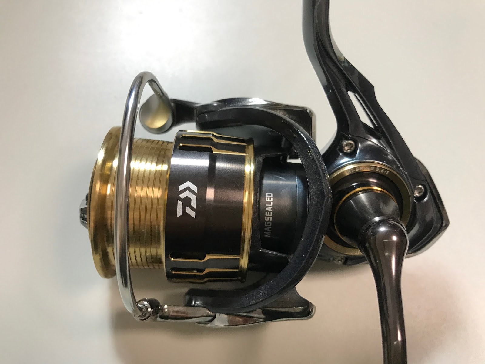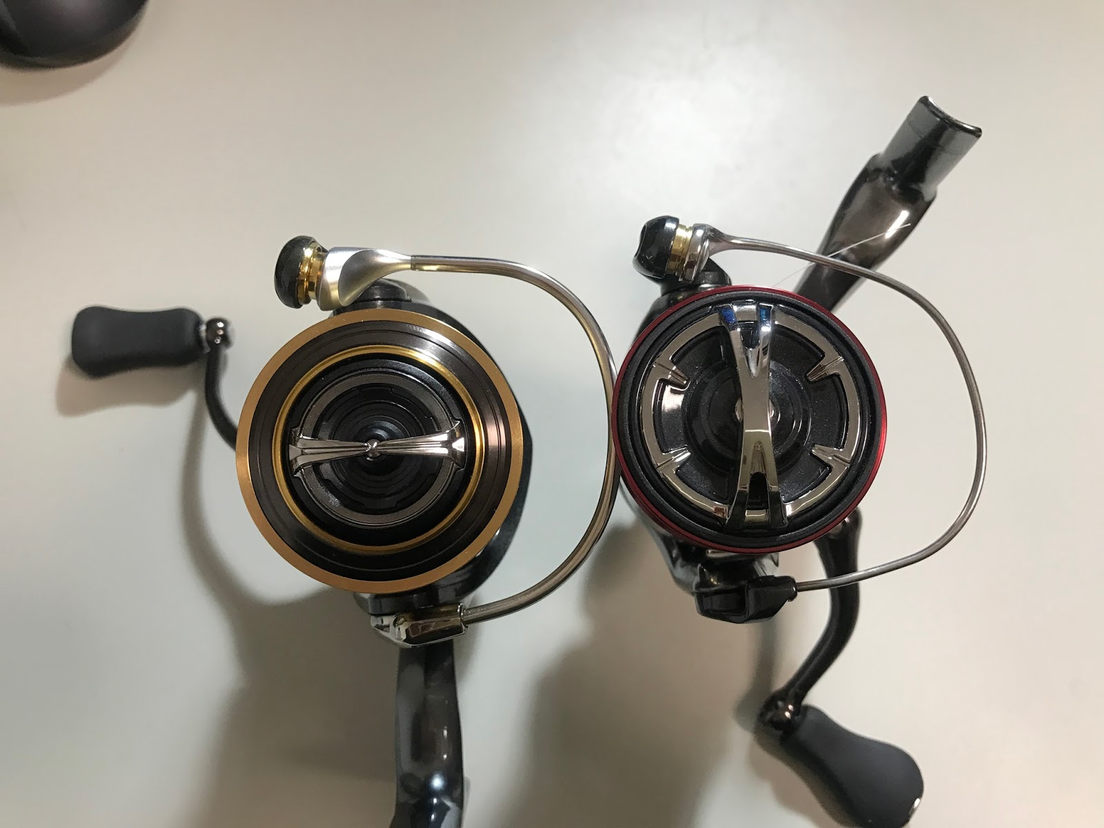 見た目で違いが大きく出るのが、ベールのところかな。ダイワのベールはエアベールと呼ばれる中空構造になっているので、シマノと比べるとかなり太い。ただ重さは変わらず強度はアップしているようだ。また糸絡みトラブルを激減させる形状になっているらしい。ここは使ってみるとかなり違いを感じるところだと思われます。