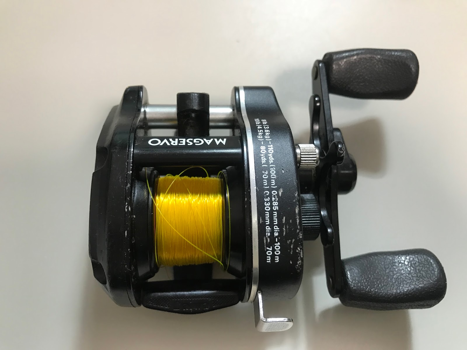 ダイワのファントムマグサーボGS-5というモデルです。このリールは自分が小学生時代にメインで使っていたリールです。よく生き残っていました。物置きの中でずっと眠っていました。ラインも当時巻いたものがそのままです。ラインはオレンジ色なんですが、昔はナイロンラインと言えばだいたいこのような色でしたね。