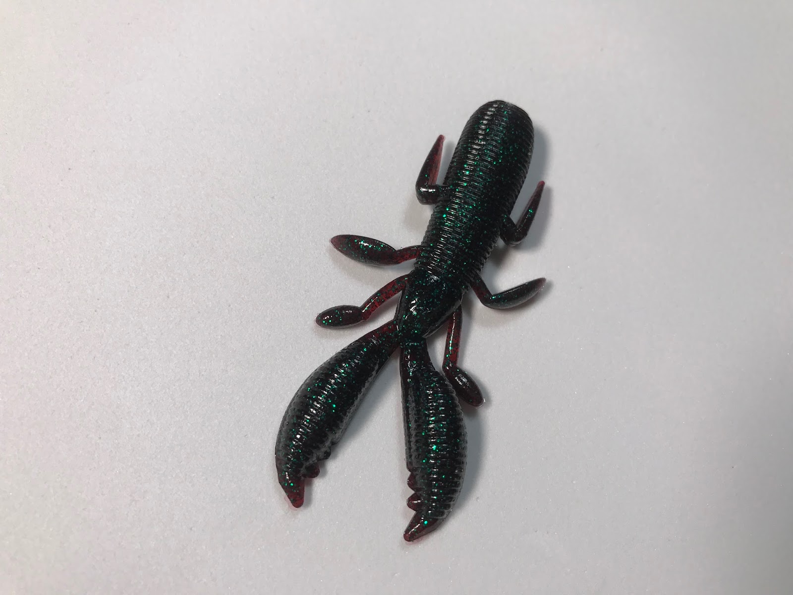 爪の部分がかなりボリュームがある。水を受けたときにブルブルしそうだ。また足の部分も水を受けた時にパタパタ動くのだろう。バサー誌では中層スイミングでも釣れるという内容だったが、この足が効果的に動くと思われます。ジャッカルのシザーコームのスイミングで釣ったことはあるので、大体イメージはつく。