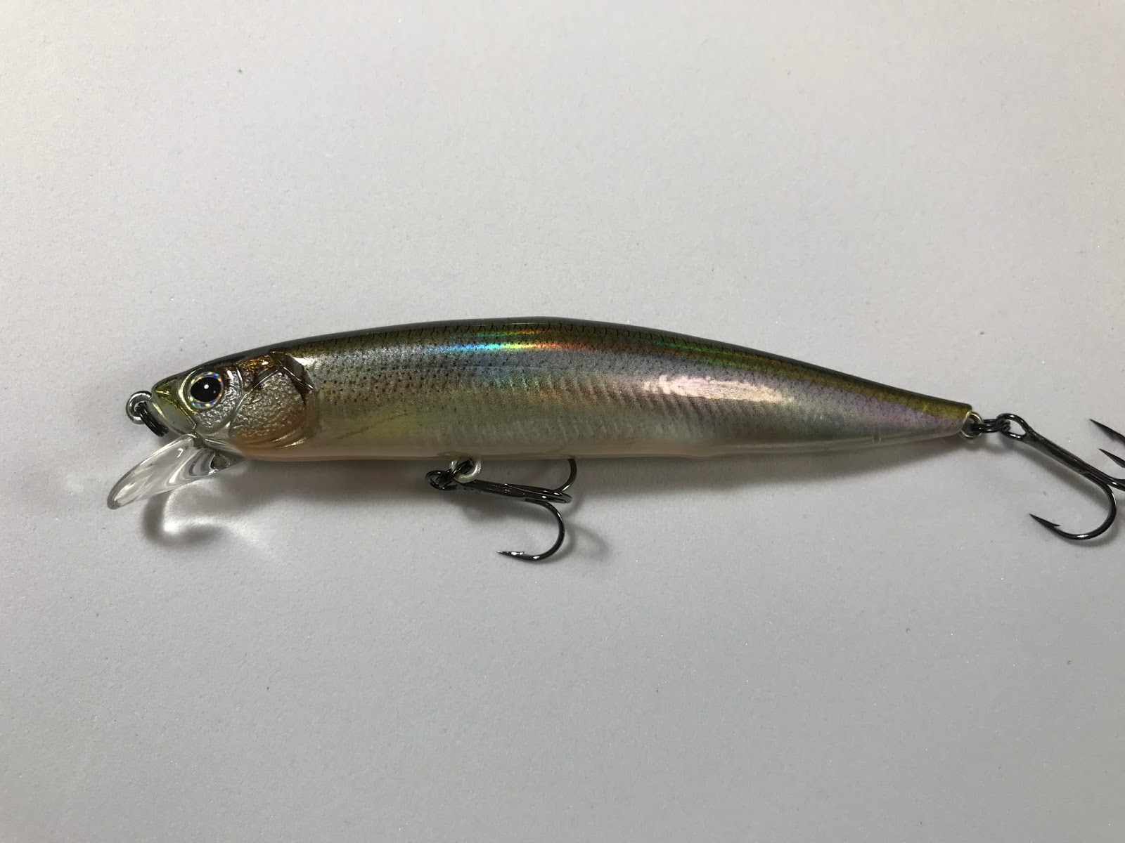 3DRグリーンワカサギというカラーのものを購入しました。おそらくワカサギカラーは一番人気があるはずです。初代のゲキアサより長さが短くなって105mmになったので、かなり本物のワカサギに近いフォルムになってますね。まああまり霞ヶ浦水系で本物のワカサギを見たことがないのだが(;´Д`)。