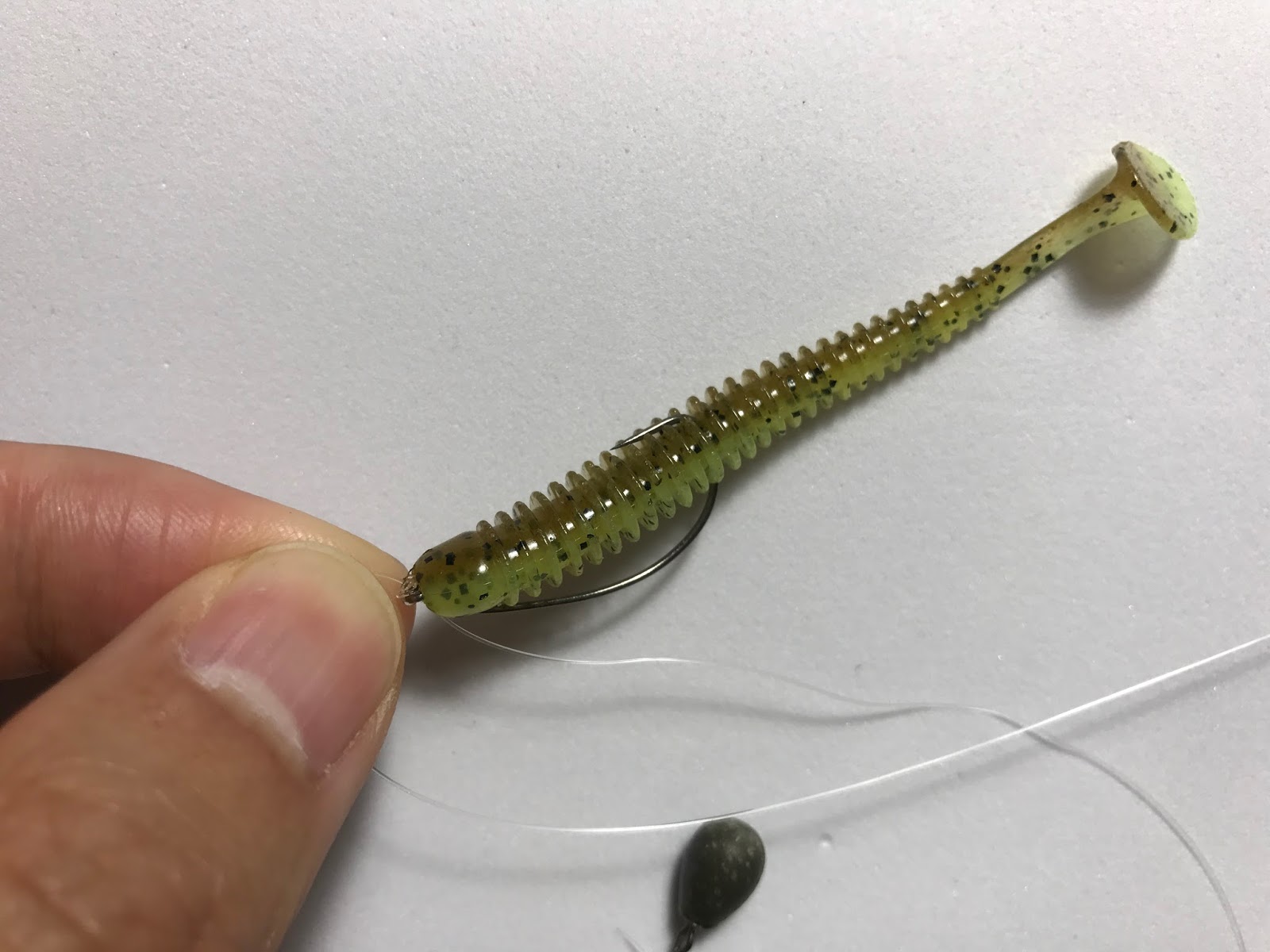 このスイングインパクト2.5inchの使い方ですが、基本はダウンショットリグで使用します。使用するフックはFINAのTNSオフセットの5番です。このフックが最高にマッチングが良いですね。シンカーはダイワのナス型のシンカーで3.5gを使用しています。タックルはベイトフィネスで使うので3.5gがベストですが、風が強い時などは5gを使うこともあります。