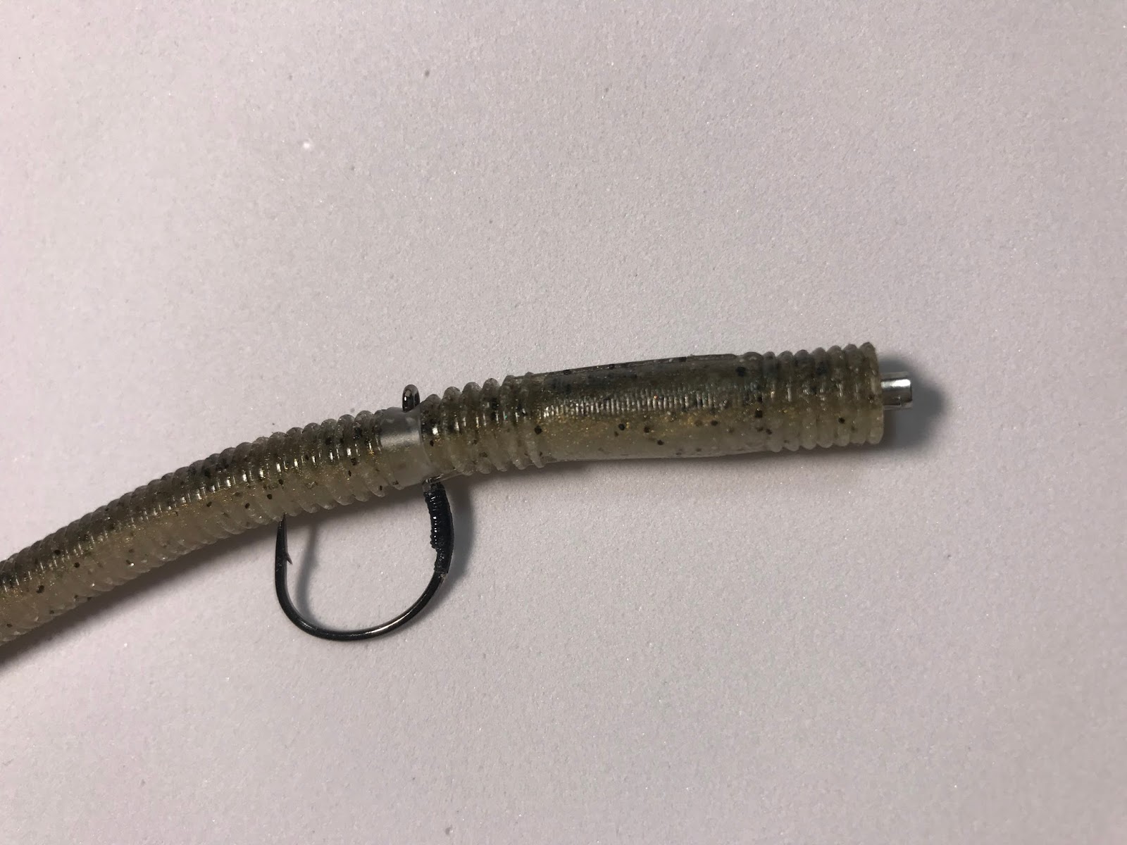 このブレーバーのリグり方ですが、自分の場合少し変わったことをやってます。まず頭を1inch(2,3cm)分切り落とします。ブレーバーは5.7inchのサイズしかなく、少しデカイなという印象が自分にはあるので、短くして4.7inchワームとして使います。切り落とした頭にネイルシンカーの1.8gを入れます。1.8gにしているのはやや重めにした方が、フォールでの動きが良くなるからです。できればもっと重い方が良いと思うが、あまり釣具屋に重いネイルシンカーの在庫がないし、値段が高いので1.8gを使います。
