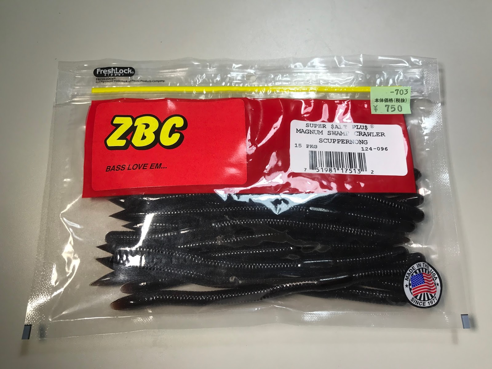なんの変哲も無いストレートワームです。でもこのただのストレートワームが釣れるのだ。日本のワームは余計な足やリブが付いてるものが多いが、ZBCスワンプには何も付いてない。