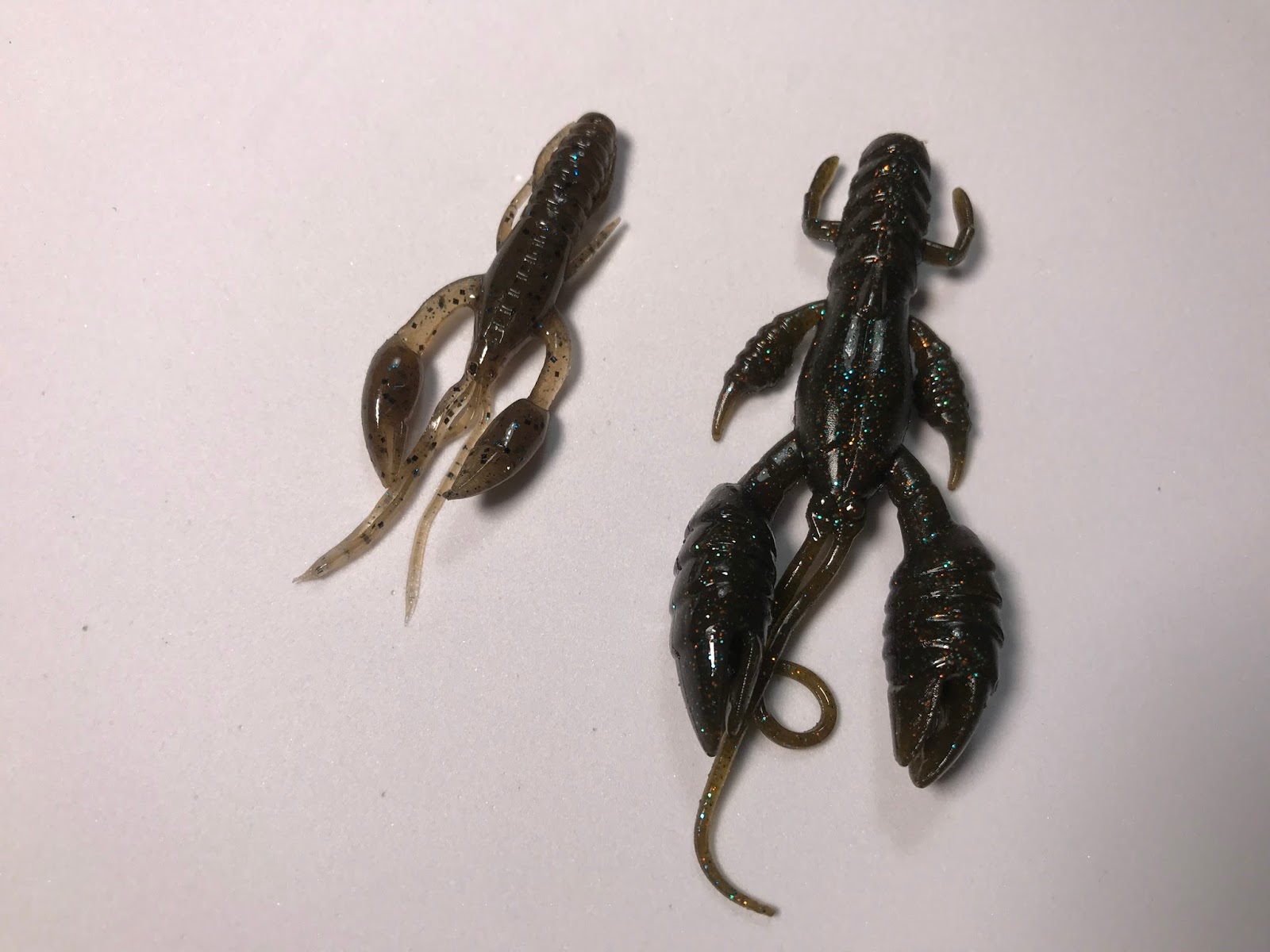 ザリガニに似せるために、クロー系ワームもよく使われます。フォール中に大きなハサミをバタバタさせてアクションする。ワーム自体の重量もあるので、軽いスモラバに使うと重くなってキャストしやすくなります。