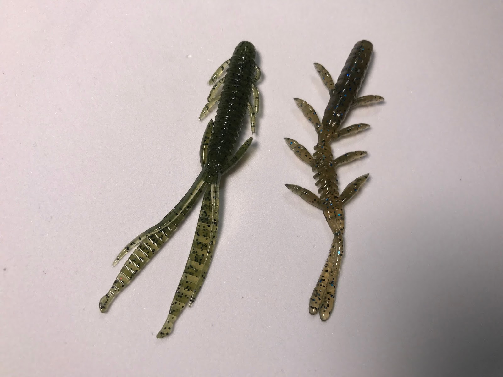エビに似せるために、シュリンプ系のワームもよく使われます。これはフォールでもシェイクでもいけますね。ただどちらもアクションは控えめ。自分はあまり使わない。よく使われるのが、OSPのドライブシュリンプ、ジャッカルのシザーコームなどでしょうか。