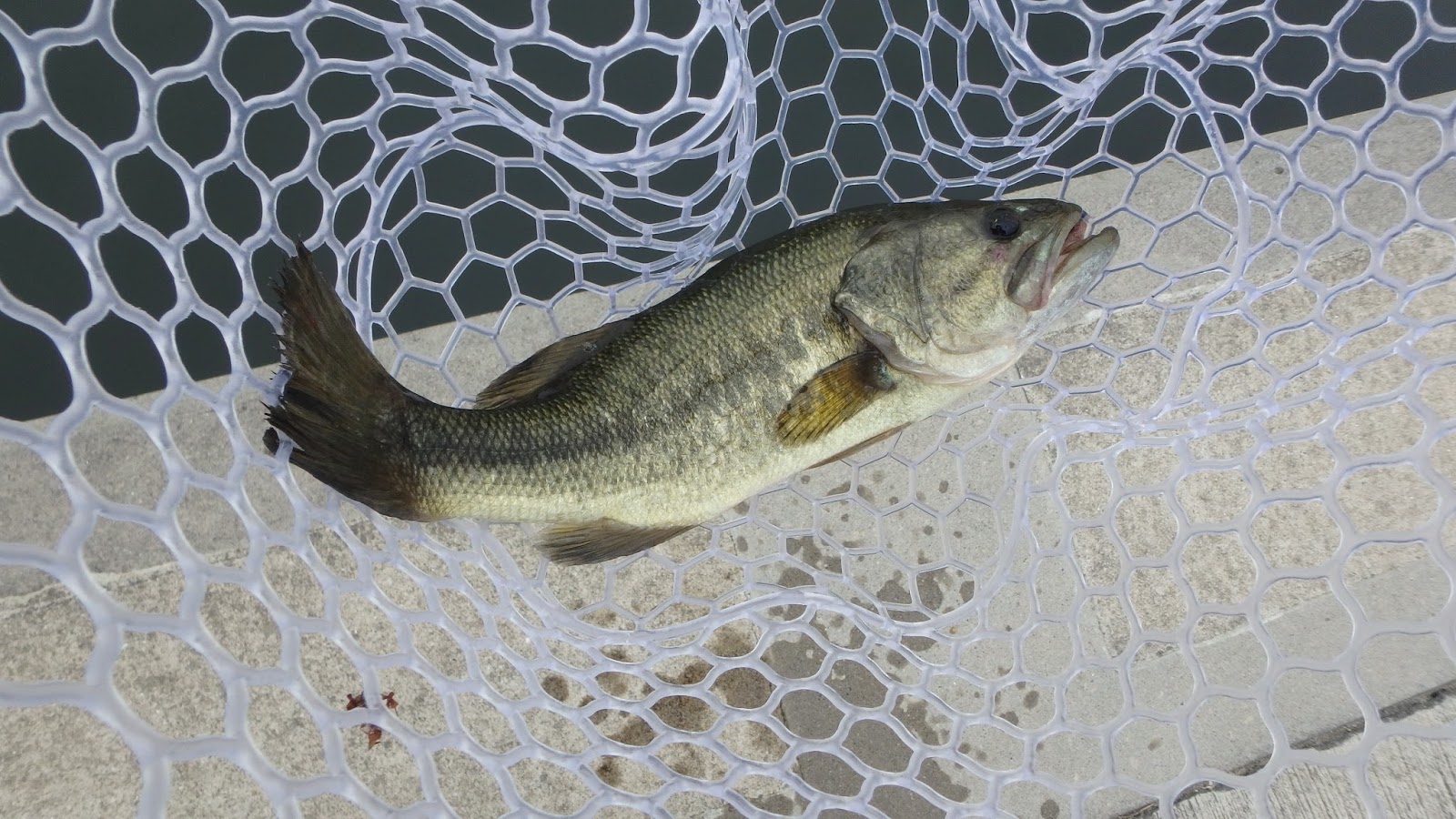 これも30cmぐらい。ルアーはトルキーストレート4.8inchのネコリグ。久々にトルキーストレートで釣った。久々だったが、やっぱ使い易いワームだと思った。釣った個体は元気のいいヤツだった。護岸際ではなく沖で釣れた。なるほど今日はディープに落ちているのかと思ってその後沖に投げて釣っていたが、その後は反応なし。移動する。