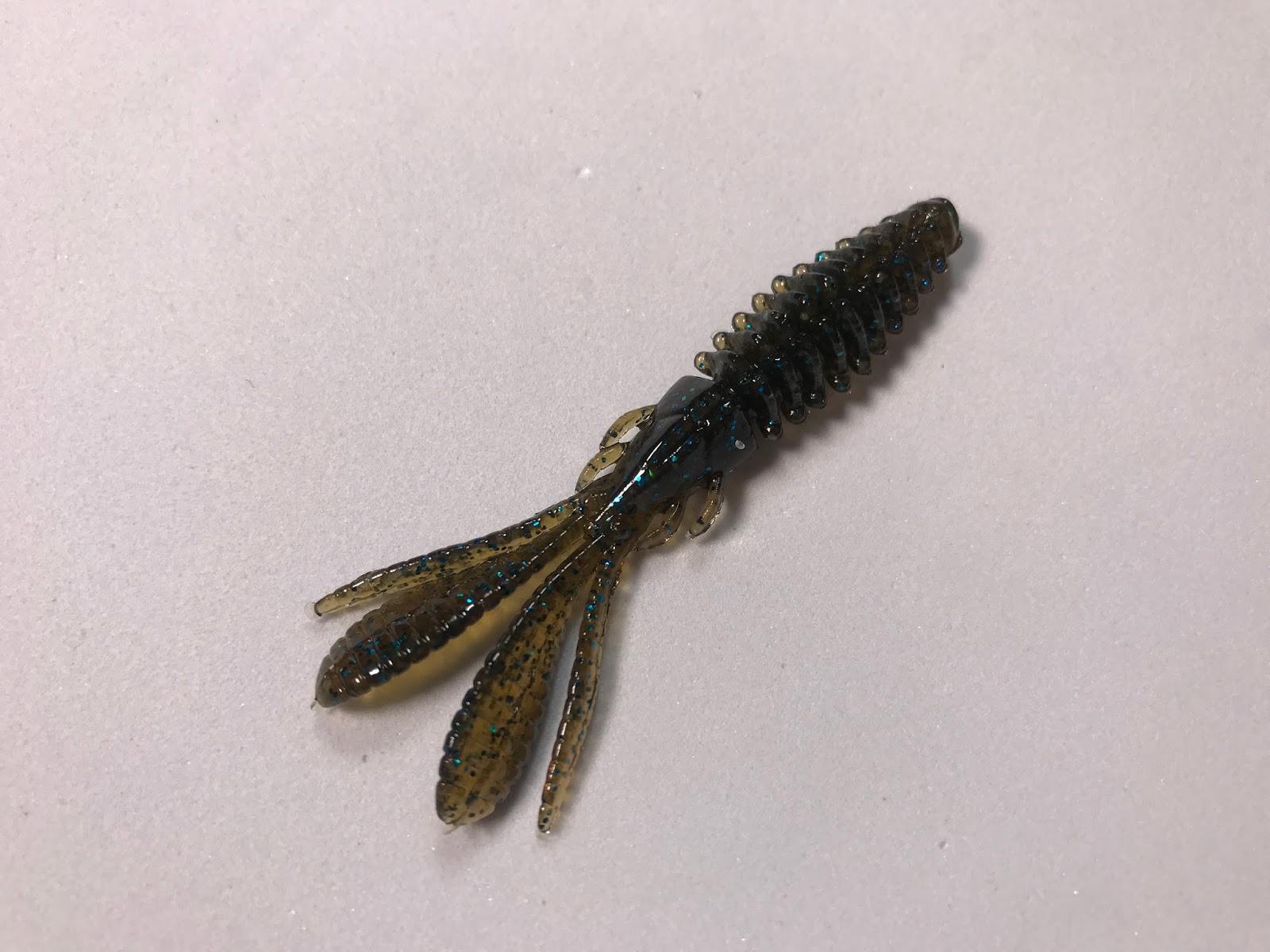 最近ビビビバグをかなり使っております。キャロライナリグの時は必ず使うワームになってますね。とにかくリアルで、止めた時にパッと4本の腕が広がるのが良いですね。パッと広がったタイミングで喰われているような気がします。