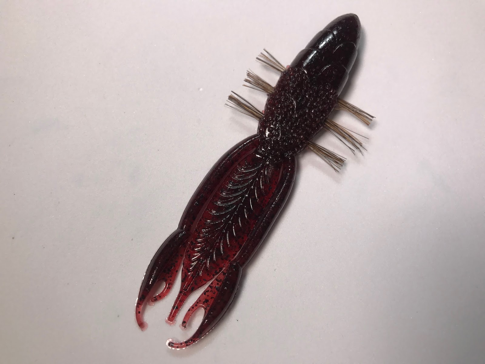 このワームはヘビーカバーに打ち込む用のワームです。この手の形をしたワームはアメリカなどではよく見かける感じのものです。ボリューム感のあるバルキーなボディで、ザリガニをイミテートしている。デカイバスが釣れそうな気がしますね。