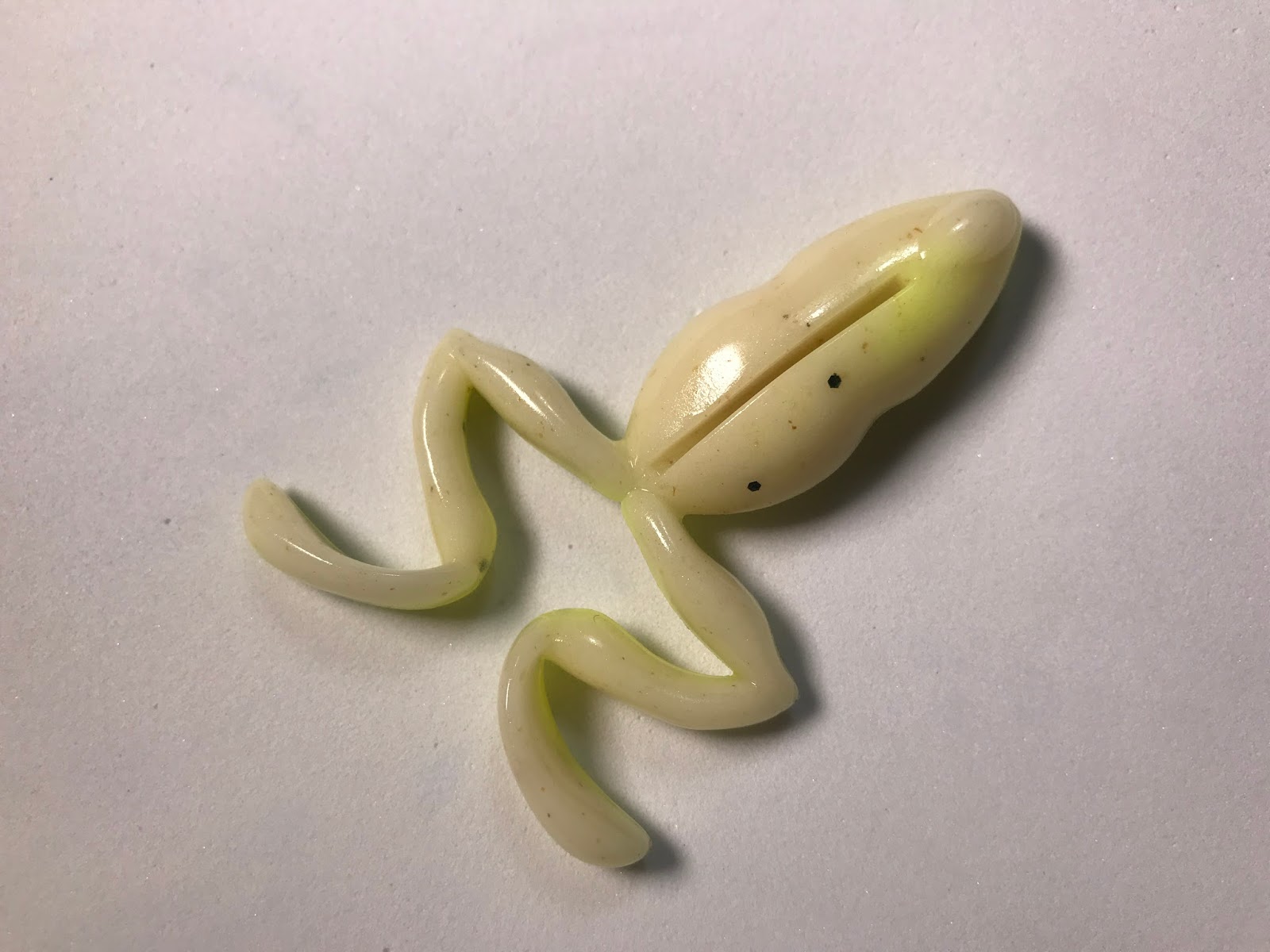 お腹にはフックを刺すスリットが入っている。これで普通のワームのオフセットフックを使えるのが良い点だ。通常のフロッグはフッキングが悪いのだが、これならよくフッキングすると思う。かなりリアルだし釣れそうだわ。