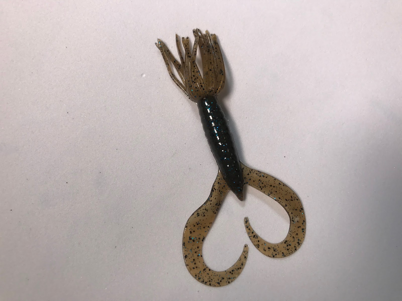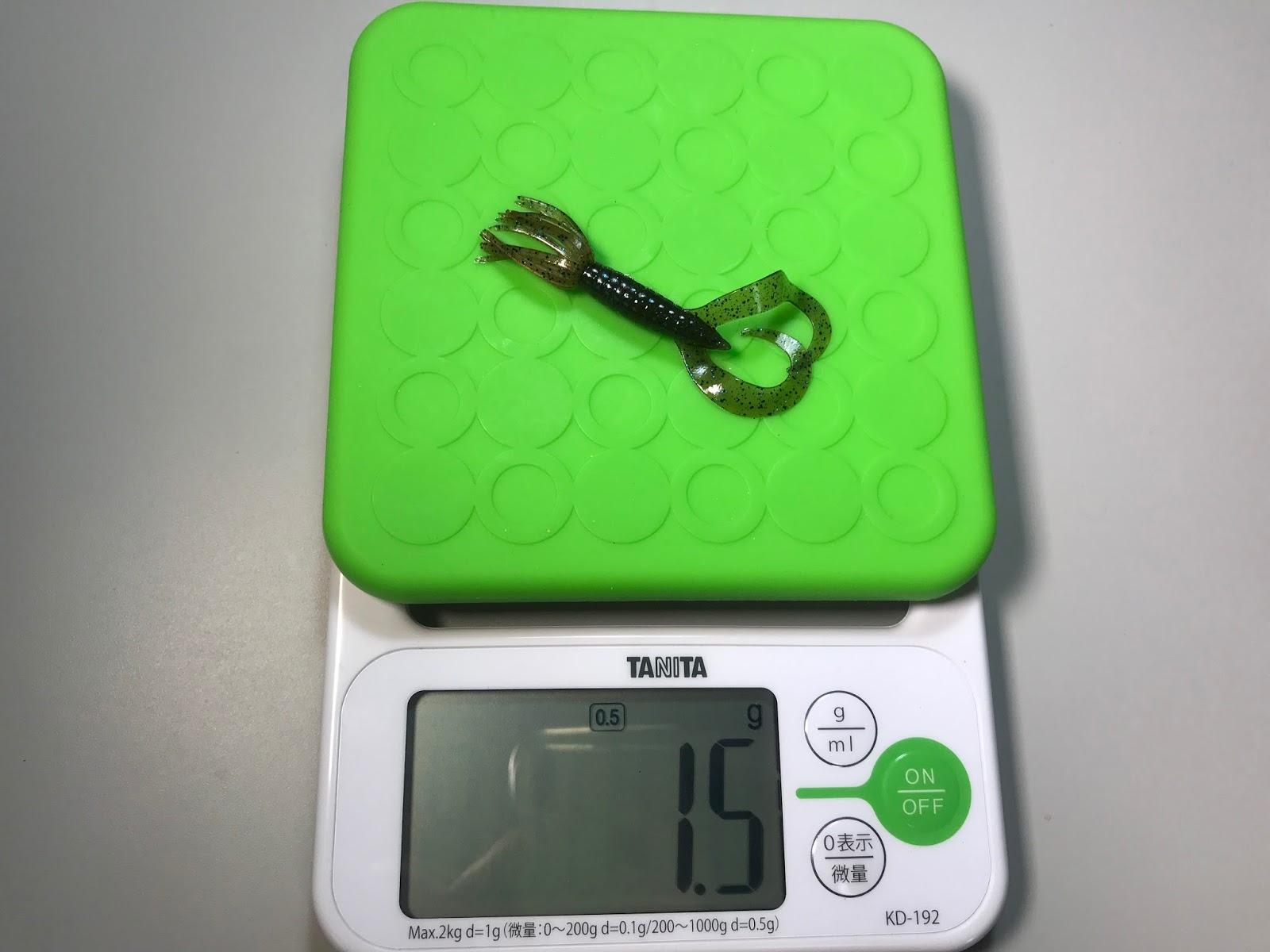 1.5gです。スカートが付いている割には軽いですね。ツインテールも薄くてヒラヒラしている。こんだけフィネスなワームですけど、スレたバスには効かないんだよな。ワームは人がアクションつけてなんぼのもんですよ。もはやワームの見た目だけで騙されるバスは日本にはいないのではないかと思う。