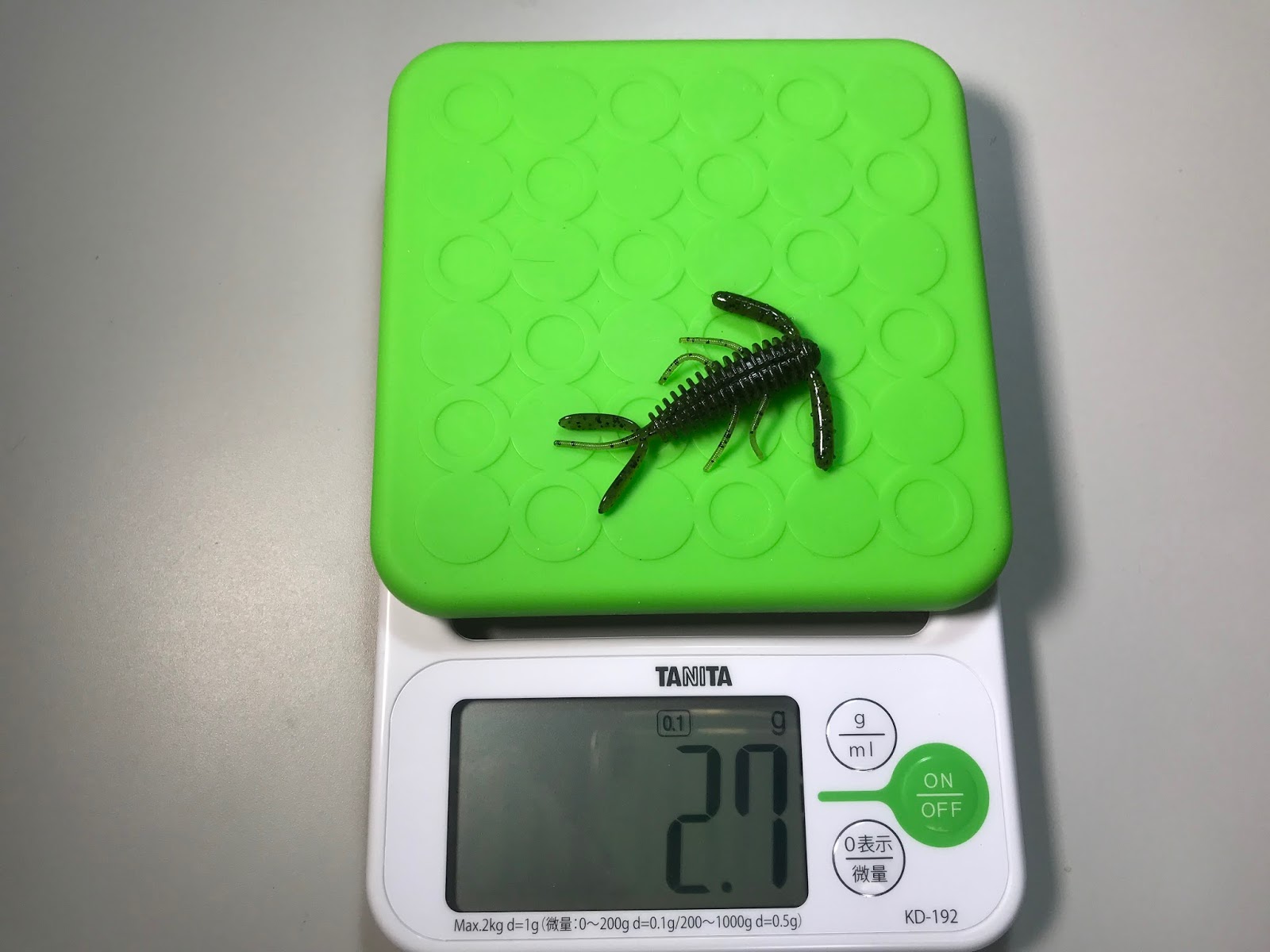 重さは2.7gあります。使用方法としては、スモラバのトレーラー、ダウンショットリグ、ライトテキサス辺りで使うと良さ気ですね。6本付いた奇妙な足をブルブルさせると釣れそうだな。スピニングならノーシンカーで使うと良さ気だ。