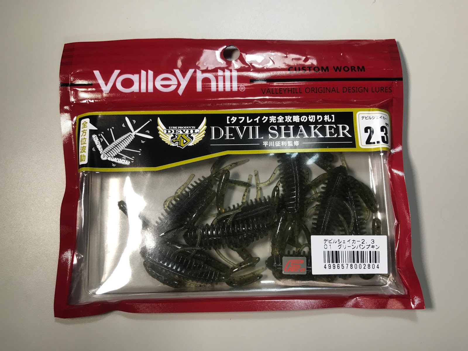 今日は買物ネタです。釣具屋に行ったら、何やら奇妙な形をしたワームが売られていたので買ってみた。バレーヒルのデビルシェイカーというワームです。奇妙なアシが何本も付いてます。この手のフィネスなワームはとりあえず買ってしまうな(;´Д`)。