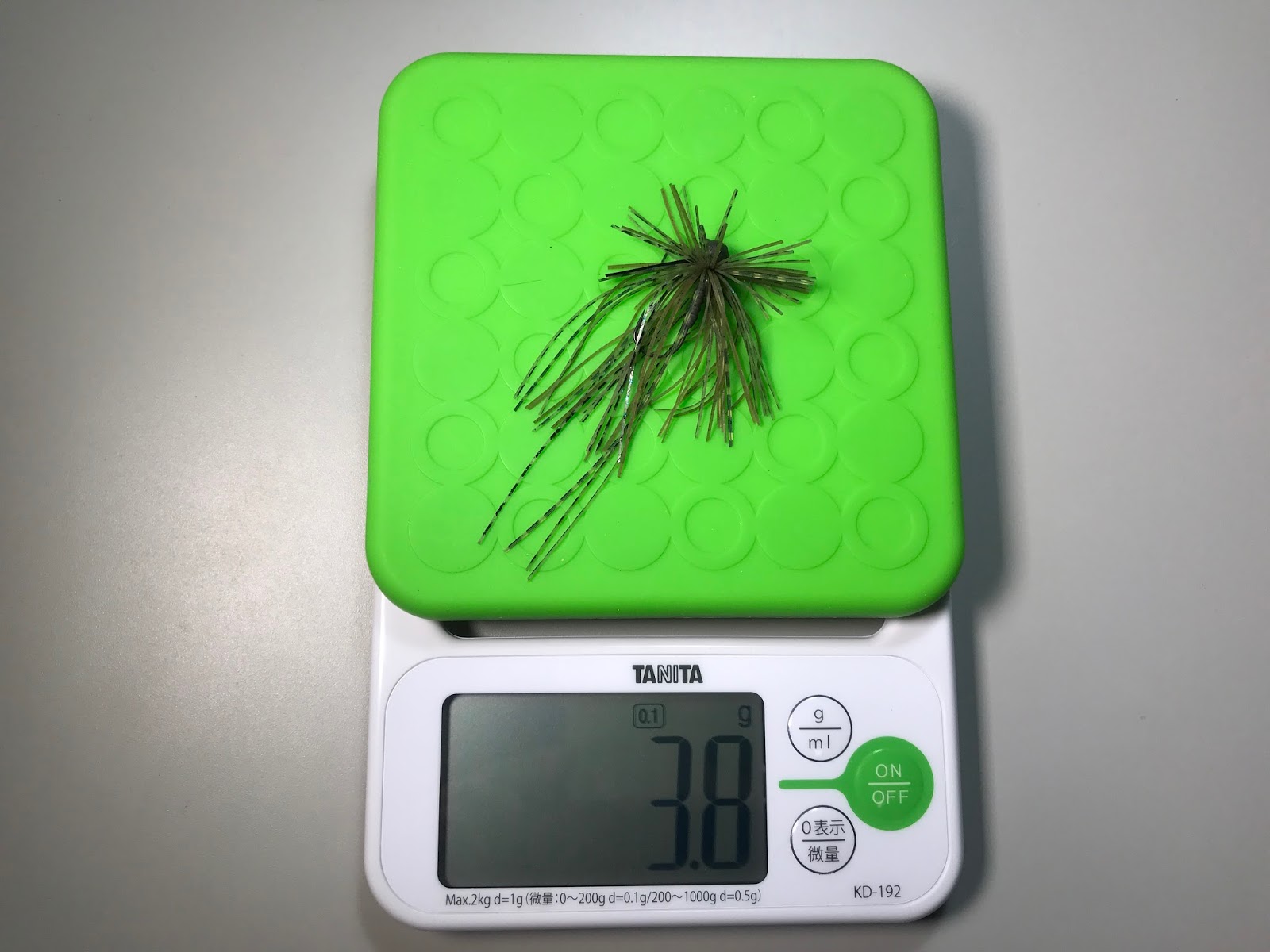 2.7gのスモラバを買ったが、総重量は3.8gある。シリコンラバーは細めのタイプ。太い方が好きなのだが、まあ細めの方が一般的ではある。シリコンラバーは伝説の阿部式テナガエビカットになっているらしい。伝説って?