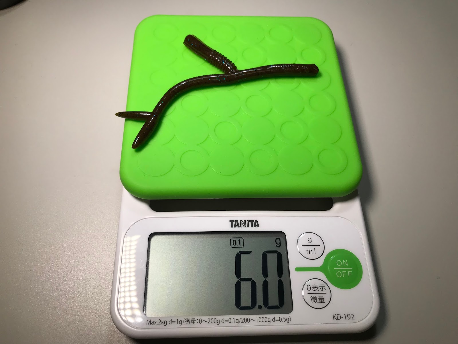 重さは6gある。単体でもまあまあ重い。これに3.5gのネイルシンカーを付けたら、トータル約10gになるので、ある程度ヘビーなベイトタックルでも使える。