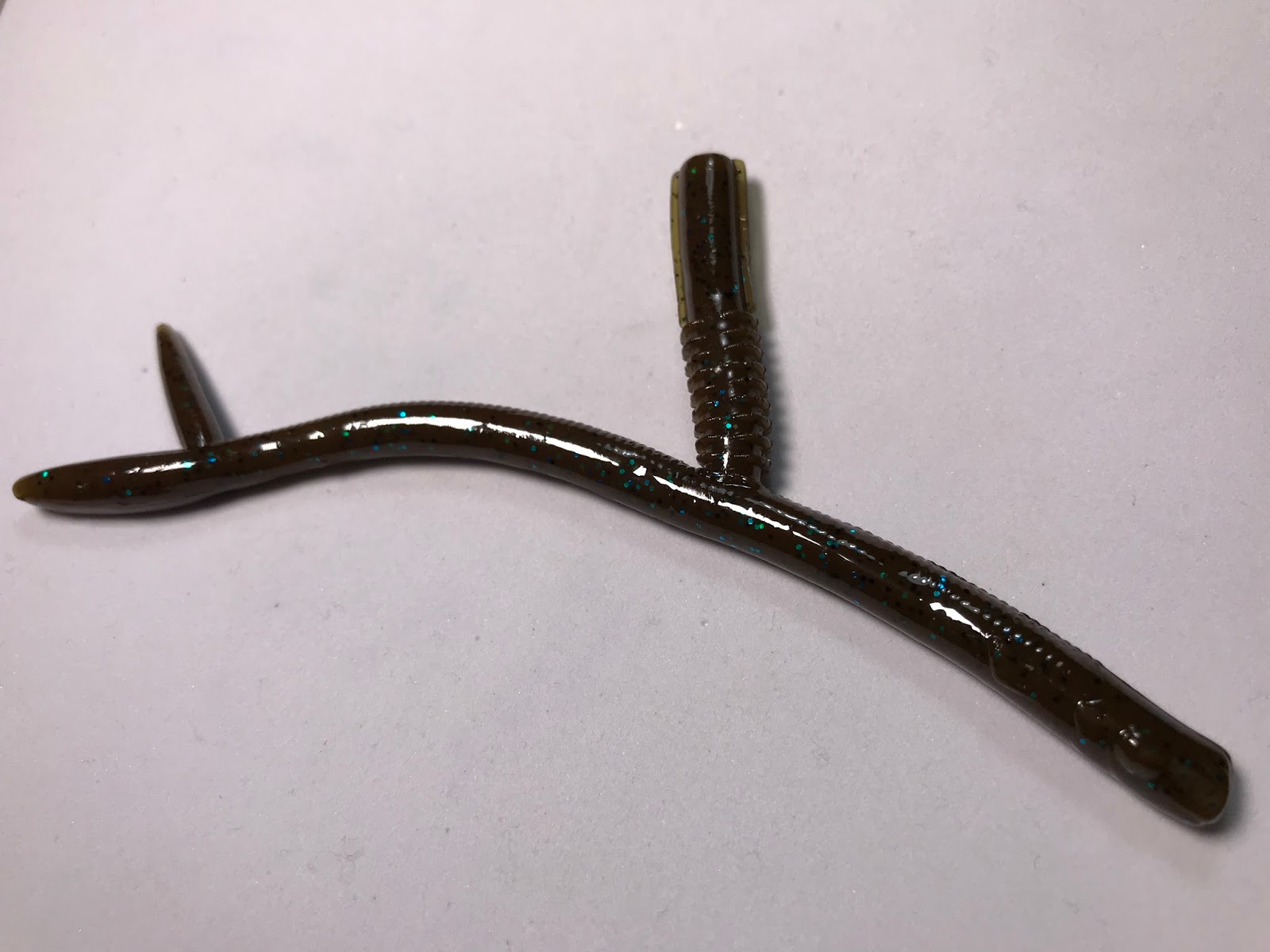 特徴は奇抜な形だが、ネコリグをオフセットフックで使いたいという発想から生まれた形だと思う。オフセットフックの根掛かり回避性能をネコリグにも入れたいとは誰しも考えると思う。ゲーリーヤマモトから販売されていたA-OKというワームと形が似ているが、あれも同じ発想だと思う。