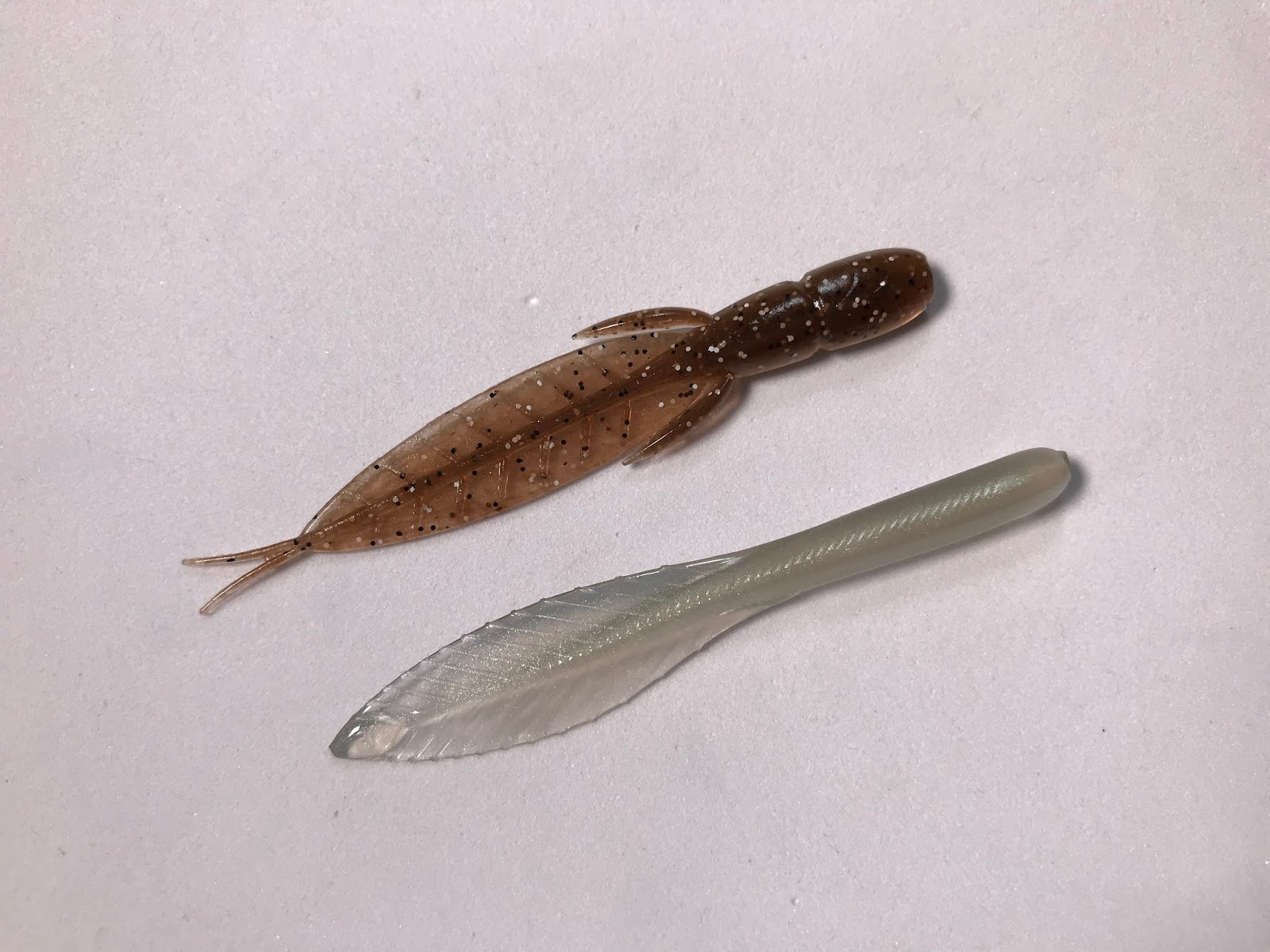 リーチワームと言えば、2年ぐらい前に出たDSTYLEのフーラがあるが、それと比較してみた。フーラは最近あまり使わなくなってしまったが、テールが超薄くてかなりリアルなワームだ。C-4リーチの方は足が付いてますね。水の受け方がちょっと変わりそうだ。