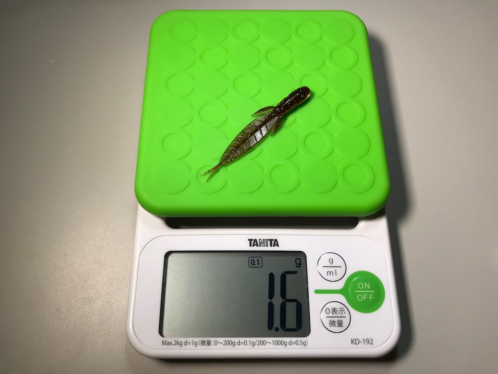 自重は1.6gです。かなり軽い。使い方はダウンショットリグで使うのがメインになると思います。ノーシンカーで使っても良いかも。