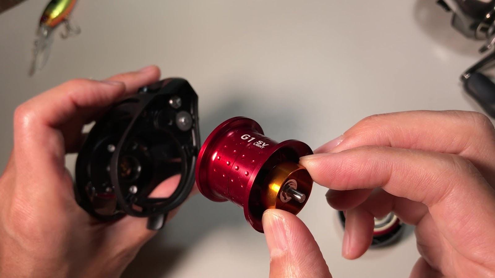 このリールの最大の特徴はスプールです。外観はハッキリ言って違いはないが、スプールは今までにないものになっています。SVスプールとAIR系スプールの中間サイズのスプールになっている。重すぎず軽すぎない。ベイトフィネスで扱うようなルアーから、通常のスピナーベイトやクランクベイトまで扱えるものになっている。