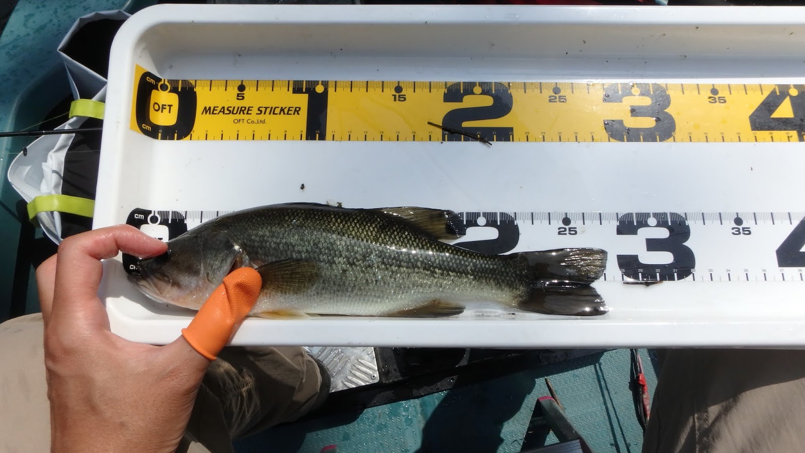 32cmぐらいのバス。釣ったのは10時ぐらいです。やっと釣れた。それまでノーバイトですよ。まったく釣れる気がしてなかったが、なんとか釣れてホッとした。リグはキャロで、リーダーは1.5mぐらい取った。ワームはビビビバグの2.6inch。