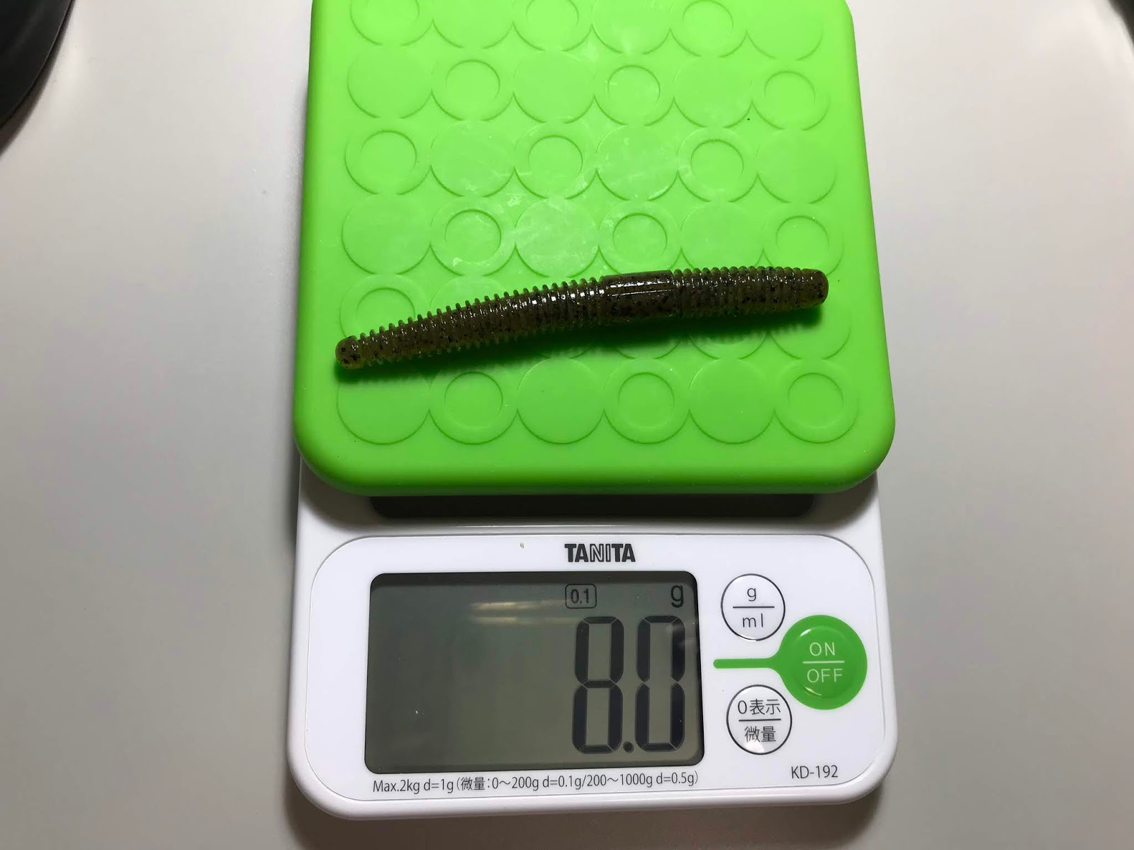 重さは8gある。ノーシンカーでも重いのでよく飛びます。重いのですが、フォールスピードが遅いと感じるときは、フックにシンカーが付いているウェイテッドフックを使うと良いようです。