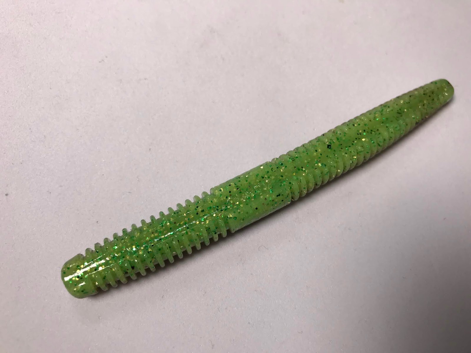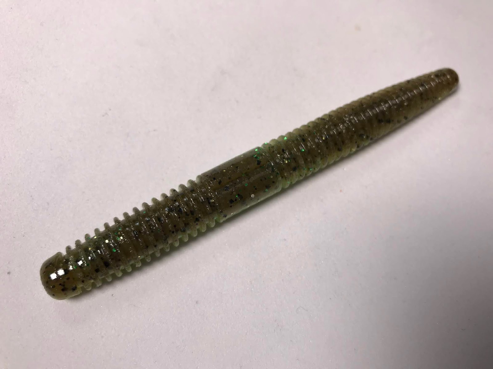 ゲーリーのヤマセンコーのようなスティック系のストレートワームなのですが、特徴としては下部が平らになっているところですね。この平らな部分が水を受けて、速すぎるフォールを抑制し、微波動を出しながら水平フォールする。