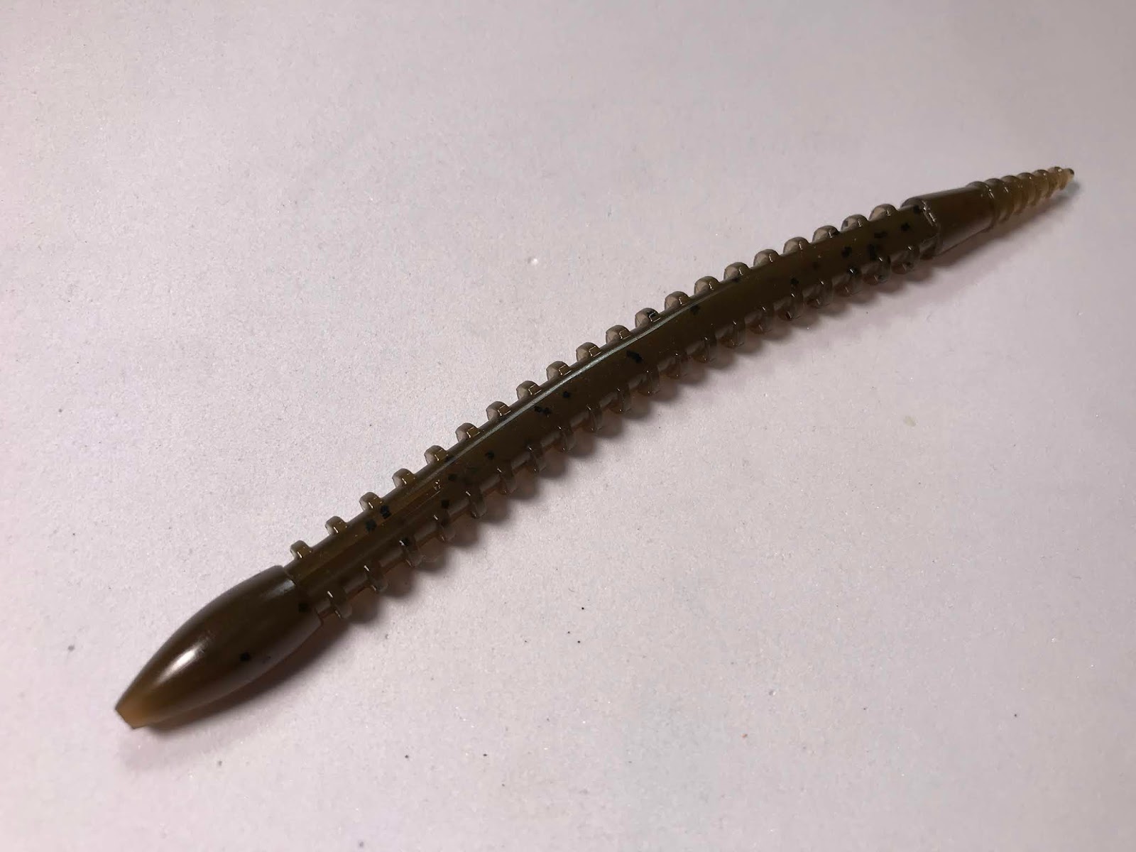 ボディに大き目のヒダヒダが付いていて、これが水を受けて微振動するのだろうね。まだ使ってませんが、この手のストレートワームはまあ釣れると思います。